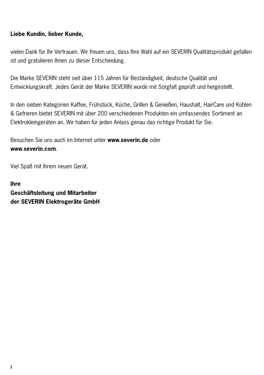 Liebe Kundin, lieber Kunde, vielen Dank für Ihr Vertrauen. Wir freuen uns, dass Ihre Wahl auf ein SEVERIN Qualitätsprodukt gefallen ist und gratulieren Ihnen zu dieser Entscheidung. Die Marke SEVERIN steht seit über 115 Jahren für Beständigkeit, deutsche Qualität und Entwicklungskraft. Jedes Gerät der Marke SEVERIN wurde mit Sorgfalt geprüft und hergestellt. In den sieben Kategorien Kaffee, Frühstück, Küche, Grillen & Genießen, Haushalt, HairCare und Kühlen & Gefrieren bietet SEVERIN mit über 200 verschiedenen Produkten ein umfassendes Sortiment an Elektrokleingeräten an. Wir haben für jeden Anlass genau das richtige Produkt für Sie. Besuchen Sie uns auch im Internet unter www.severin.de oder www.severin.com. Viel Spaß mit Ihrem neuen Gerät. Ihre Geschäftsleitung und Mitarbeiter der SEVERIN Elektrogeräte GmbH