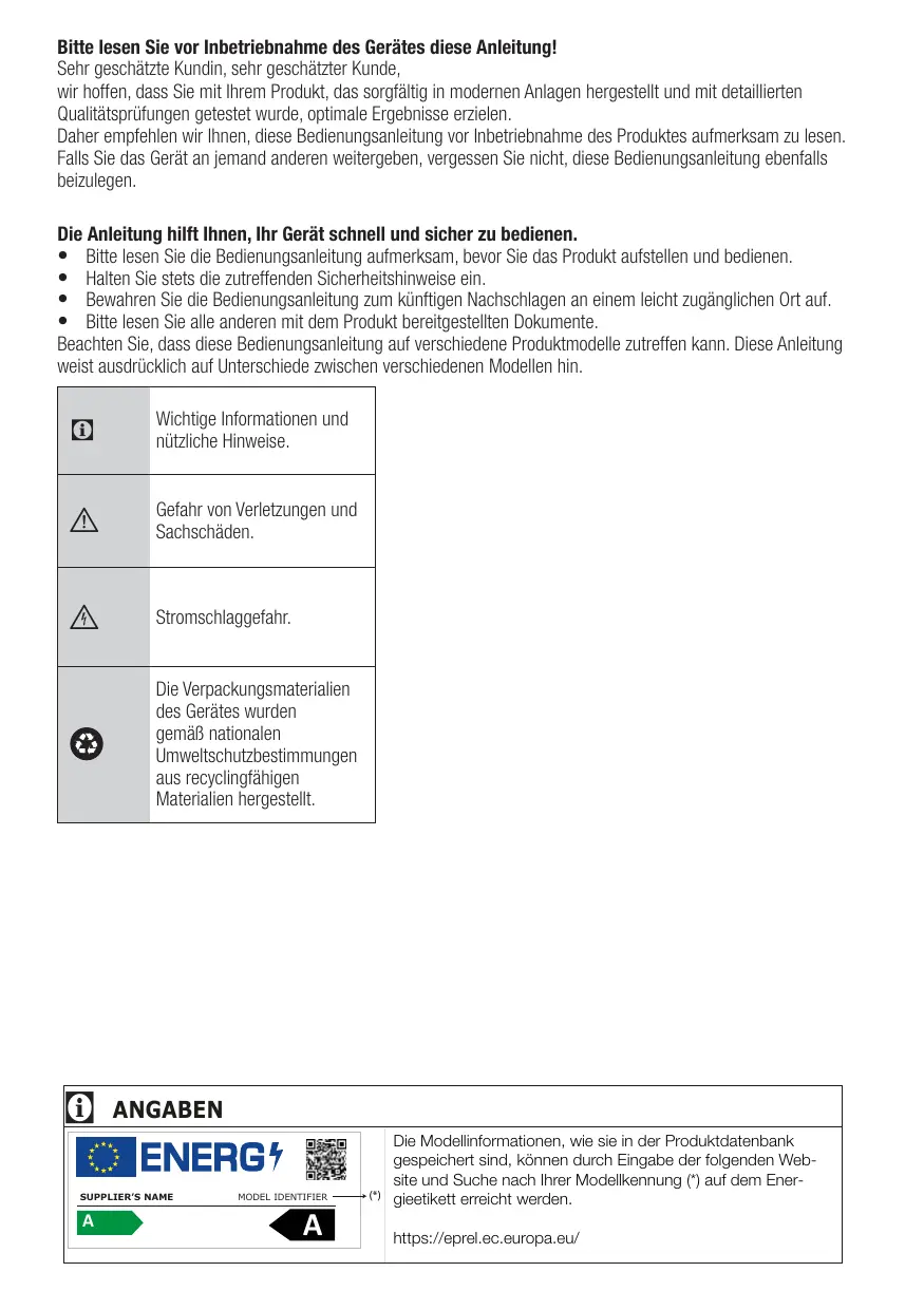 Die Modellinformationen, wie sie in der Produktdatenbank gespeichert sind, können durch Eingabe der folgenden Website und Suche nach Ihrer Modellkennung (*) auf dem Energieetikett erreicht werden. https://eprel.ec.europa.eu/