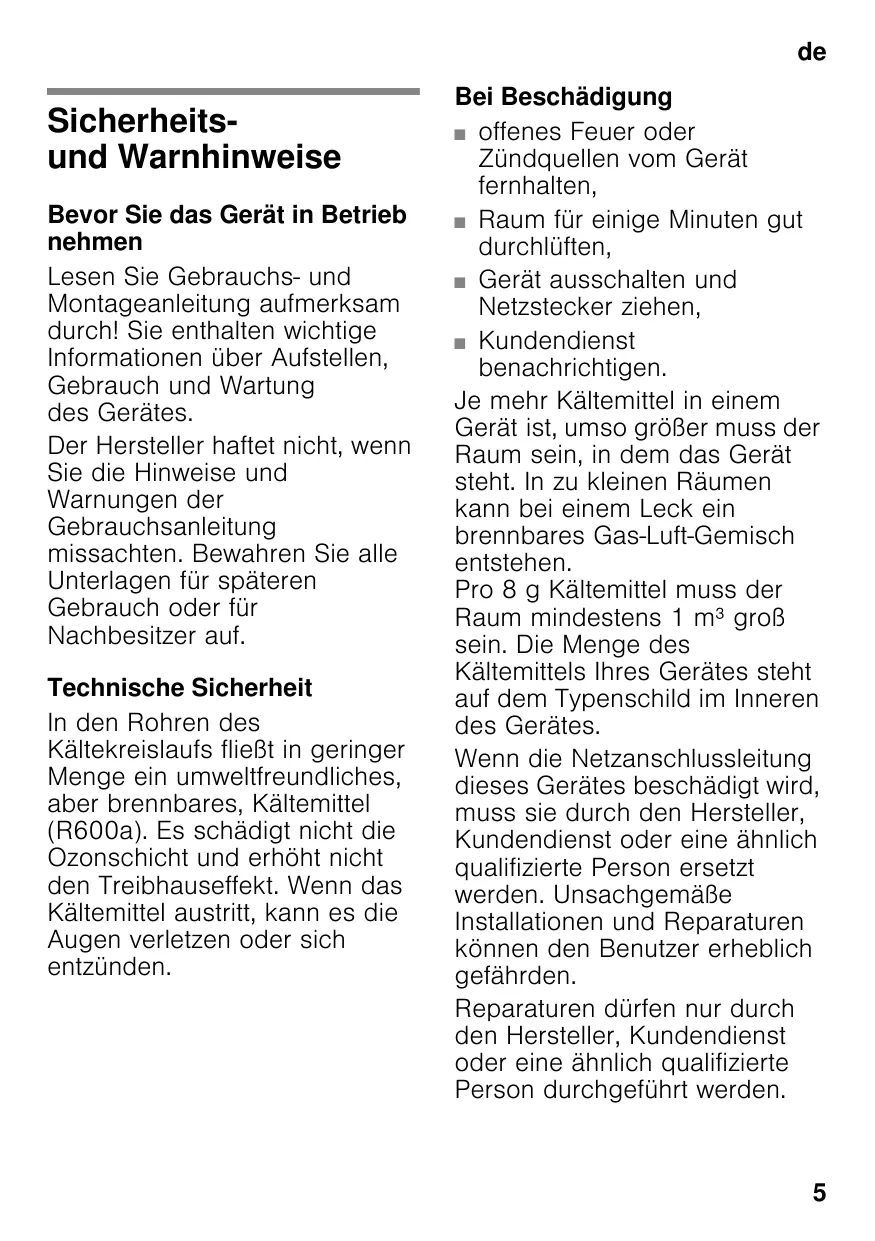 deInhaltsverzeichnisdeGebrauchsanleitung Sicherheitsund Warnhinweise Bevor Sie das Gerät in Betrieb nehmen Lesen Sie Gebrauchs- und Montageanleitung aufmerksam durch! Sie enthalten wichtige Informationen über Aufstellen, Gebrauch und Wartung des Gerätes. Der Hersteller haftet nicht, wenn Sie die Hinweise und Warnungen der Gebrauchsanleitung missachten. Bewahren Sie alle Unterlagen für späteren Gebrauch oder für Nachbesitzer auf. Technische Sicherheit In den Rohren des Kältekreislaufs fließt in geringer Menge ein umweltfreundliches, aber brennbares, Kältemittel (R600a). Es schädigt nicht die Ozonschicht und erhöht nicht den Treibhauseffekt. Wenn das Kältemittel austritt, kann es die Augen verletzen oder sich entzünden. Bei Beschädigung ■ offenes Feuer oder Zündquellen vom Gerät fernhalten, ■ Raum für einige Minuten gut durchlüften, ■ Gerät ausschalten und Netzstecker ziehen, ■ Kundendienst benachrichtigen. Je mehr Kältemittel in einem Gerät ist, umso größer muss der Raum sein, in dem das Gerät steht. In zu kleinen Räumen kann bei einem Leck ein brennbares Gas-Luft-Gemisch entstehen. Pro 8 g Kältemittel muss der Raum mindestens 1 m³ groß sein. Die Menge des Kältemittels Ihres Gerätes steht auf dem Typenschild im Inneren des Gerätes. Wenn die Netzanschlussleitung dieses Gerätes beschädigt wird, muss sie durch den Hersteller, Kundendienst oder eine ähnlich qualifizierte Person ersetzt werden. Unsachgemäße Installationen und Reparaturen können den Benutzer erheblich gefährden. Reparaturen dürfen nur durch den Hersteller, Kundendienst oder eine ähnlich qualifizierte Person durchgeführt werden.