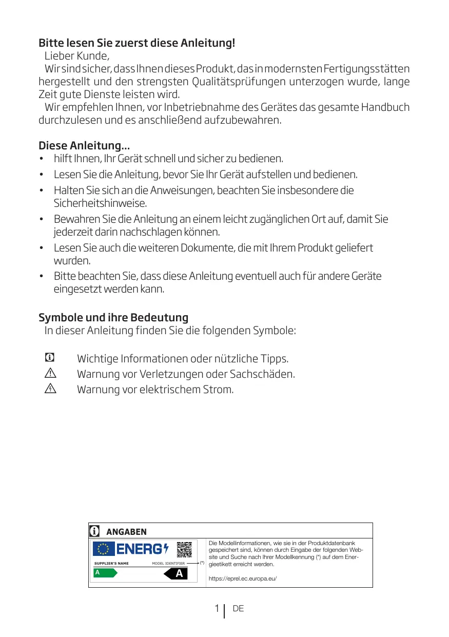 Die Modellinformationen, wie sie in der Produktdatenbank gespeichert sind, können durch Eingabe der folgenden Website und Suche nach Ihrer Modellkennung (*) auf dem Energieetikett erreicht werden. https://eprel.ec.europa.eu/