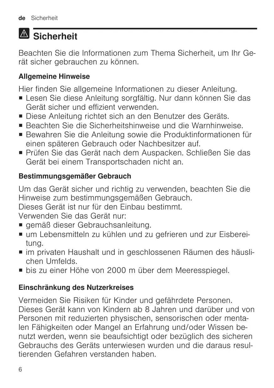 de Sicherheit Sicherheit Beachten Sie die Informationen zum Thema Sicherheit, um Ihr Gerät sicher gebrauchen zu können. Allgemeine Hinweise Hier finden Sie allgemeine Informationen zu dieser Anleitung. ¡ Lesen Sie diese Anleitung sorgfältig. Nur dann können Sie das Gerät sicher und effizient verwenden. ¡ Diese Anleitung richtet sich an den Benutzer des Geräts. ¡ Beachten Sie die Sicherheitshinweise und die Warnhinweise. ¡ Bewahren Sie die Anleitung sowie die Produktinformationen für einen späteren Gebrauch oder Nachbesitzer auf. ¡ Prüfen Sie das Gerät nach dem Auspacken. Schließen Sie das Gerät bei einem Transportschaden nicht an. Bestimmungsgemäßer Gebrauch Um das Gerät sicher und richtig zu verwenden, beachten Sie die Hinweise zum bestimmungsgemäßen Gebrauch. Dieses Gerät ist nur für den Einbau bestimmt. Verwenden Sie das Gerät nur: ¡ gemäß dieser Gebrauchsanleitung. ¡ um Lebensmitteln zu kühlen und zu gefrieren und zur Eisbereitung. ¡ im privaten Haushalt und in geschlossenen Räumen des häuslichen Umfelds. ¡ bis zu einer Höhe von 2000 m über dem Meeresspiegel. Einschränkung des Nutzerkreises Vermeiden Sie Risiken für Kinder und gefährdete Personen. Dieses Gerät kann von Kindern ab 8 Jahren und darüber und von Personen mit reduzierten physischen, sensorischen oder mentalen Fähigkeiten oder Mangel an Erfahrung und/oder Wissen benutzt werden, wenn sie beaufsichtigt oder bezüglich des sicheren Gebrauchs des Geräts unterwiesen wurden und die daraus resultierenden Gefahren verstanden haben.