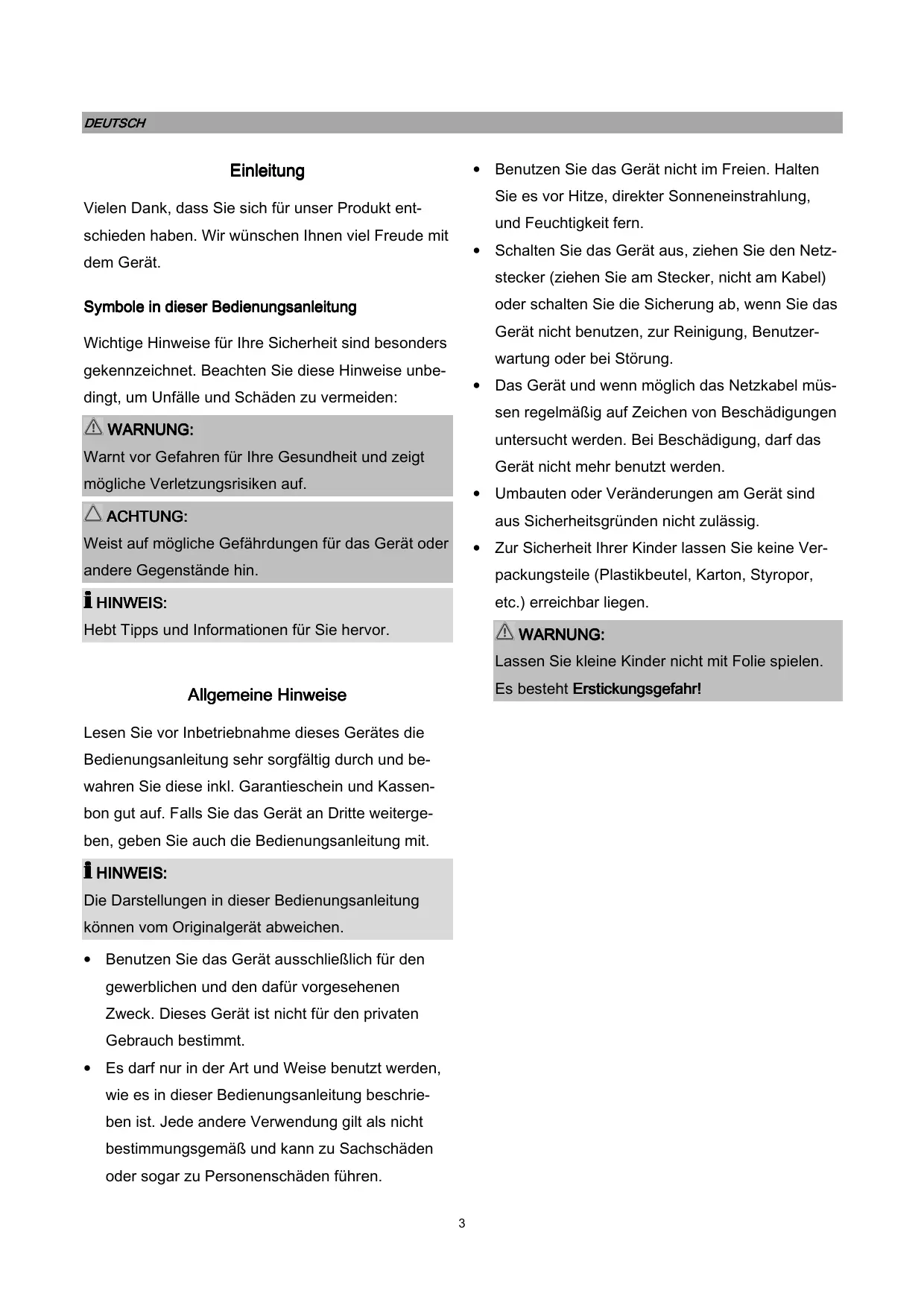 • Es darf nur in der Art und Weise benutzt werden, wie es in dieser Bedienungsanleitung beschrieben ist. Jede andere Verwendung gilt als nicht bestimmungsgemäß und kann zu Sachschäden oder sogar zu Personenschäden führen.