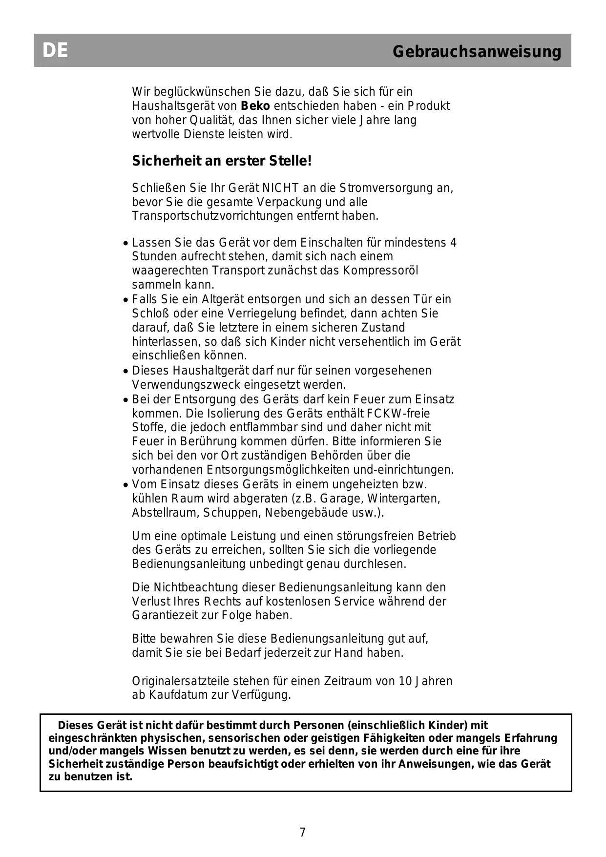 électrique avant d’avoir enlevé tout l'emballage et protections pour le transport. • Attendez au moins 4 heures avant de le brancher pour permettre à l’huile du compresseur de se stabiliser si l’appareil a été transporté horizontalement. • Si vous vous débarrassez d'un vieil appareil à ressort ou loquet intégré à la porte, prenez soin de le rendre hors de danger pour éviter que les enfants ne s'enferment à l’intérieur. • L’utilisation de cet appareil s’applique uniquement à l’usage prévu. • Ne vous débarrassez pas de l’appareil dans un feu. L’isolation de votre appareil contient des substances non CFC qui sont inflammables. Veuillez contacter les autorités locales pour obtenir des renseignements concernant la mise au rebut et les endroits existants. • L’utilisation de cet appareil dans une pièce froide, non chauffée n’est pas recommandée (garage, jardin d'hiver, annexe, abri, remise, etc.). Afin d’obtenir les meilleurs résultats possibles et un fonctionnement sans encombres de votre appareil, veuillez lire ces instructions attentivement. Le nonrespect de ces instructions pourrait annuler votre droit à l'assistance sans frais pendant la période de garantie. Veuillez conserver ces instructions soigneusement à titre de référence pratique. Les pièces détachées d’origine sont disponibles pendant 10 ans, à compter de la date d’achat du produit.