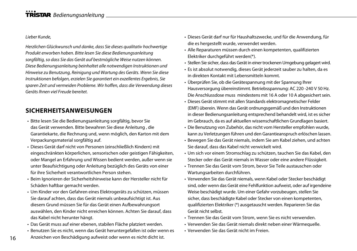 • Tristar ne sera pas responsable des dégâts matériels ou des blessures physiques résultant de la mauvaise utilisation ou si les consignes de sécurité ne sont pas correctement suivies.