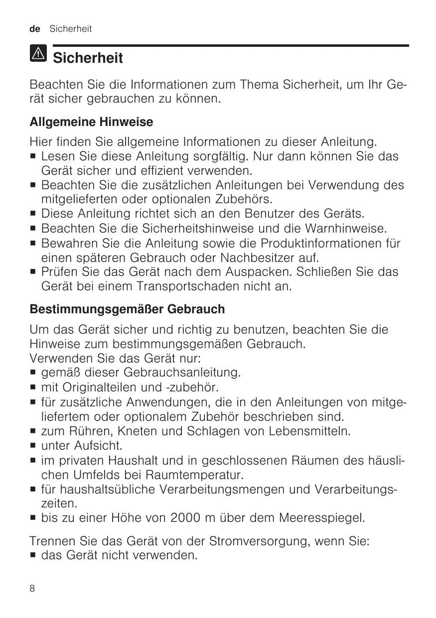 ¡ Cette notice d’utilisation s’adresse à l'utilisateur de l’appareil. ¡ Respectez les consignes de sécurité et les avertissements. ¡ Conservez la notice ainsi que les informations produit en vue d’une réutilisation ultérieure ou pour un futur nouveau propriétaire. ¡ Contrôlez l’appareil après l’avoir déballé. Ne raccordez pas l’appareil si ce dernier a été endommagé durant le transport. Conformité d’utilisation Respectez les consignes d'utilisation afin d'utiliser l'appareil correctement et en toute sécurité. Utilisez l'appareil uniquement : ¡ en conformité avec la présente notice d’utilisation. ¡ avec des pièces et accessoires d’origine. ¡ pour les utilisations décrites dans les instructions des accessoires fournis ou disponibles en option. ¡ pour remuer, pétrir et battre les aliments. ¡ sous surveillance. ¡ pour un usage domestique privé et dans les pièces fermées d’un domicile, à la température ambiante. ¡ pour les quantités de préparation et durées de traitement habituelles pour un ménage. ¡ à une hauteur maximale de 2000 m au-dessus du niveau de la mer. 41