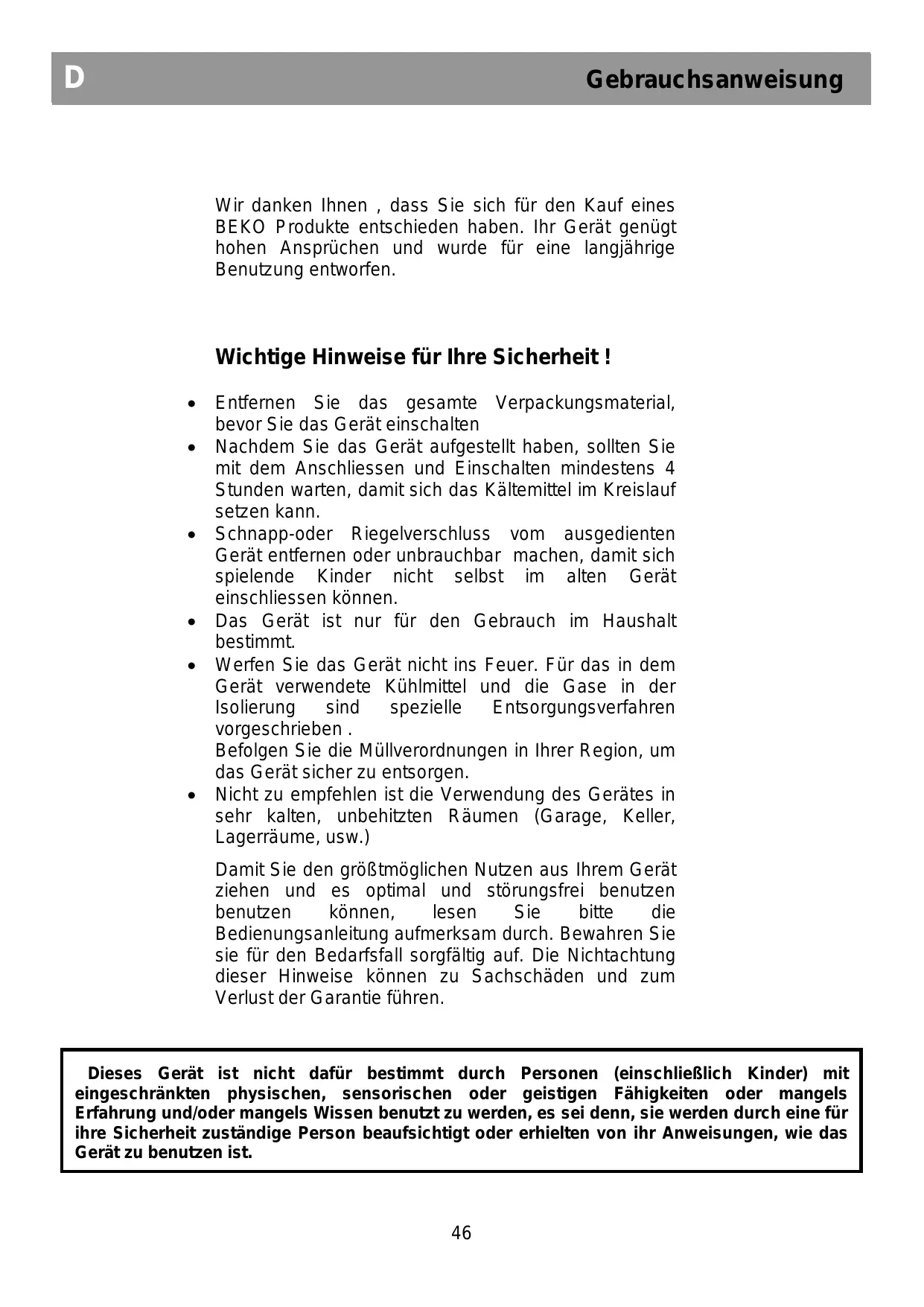 Cet appareil ne sera pas utilisé par des personnes ayant capacites physiques, sensorielles ou mentales réduites, ou sans experience concernant l'utilisation de l'appareil, si une personne responsable de leur sécurité ne les a pas instruites pour ce but.