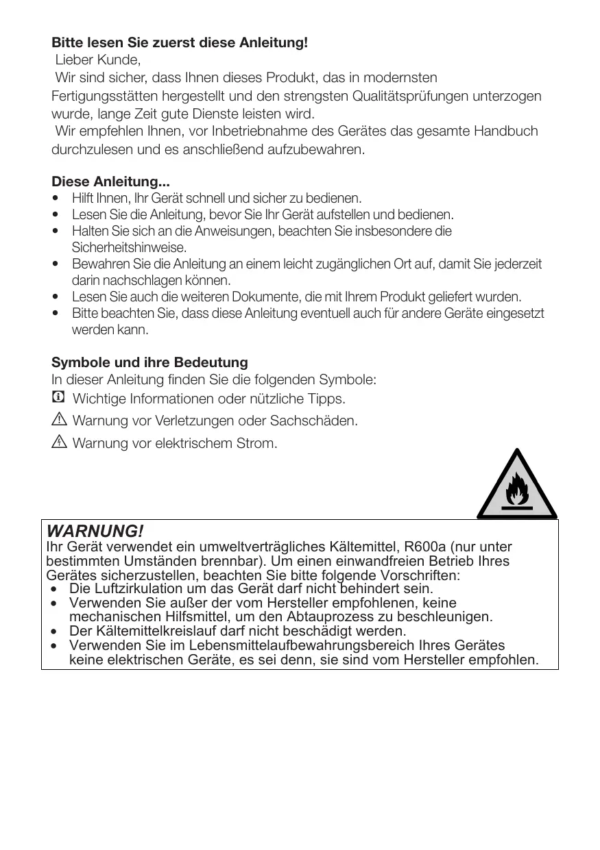 B. Propangas, in die Nähe des Kühlschranks; andernfalls bestehen Pour cette raison, nous vous conseillons de lire attentivement tout le manuel d’utilisation de votre produit avant de vous en servir, et de le conserver ensuite pour une utilisation ultérieure. Le présent manuel • Vous aidera à utiliser votre produit avec rapidité et sécurité. • Lisez le manuel avant d’installer et de faire fonctionner votre produit. • Respectez les instructions, notamment celles relatives à la sécurité. • Conservez ce manuel dans un endroit facilement accessible car vous pouvez en avoir besoin ultérieurement. • En plus, lisez également les autres documents fournis avec votre produit. • Veuillez noter que ce manuel peut également être valide pour d’autres modèles. Symboles et descriptions Vous retrouverez les symboles suivants dans le présent manuel: