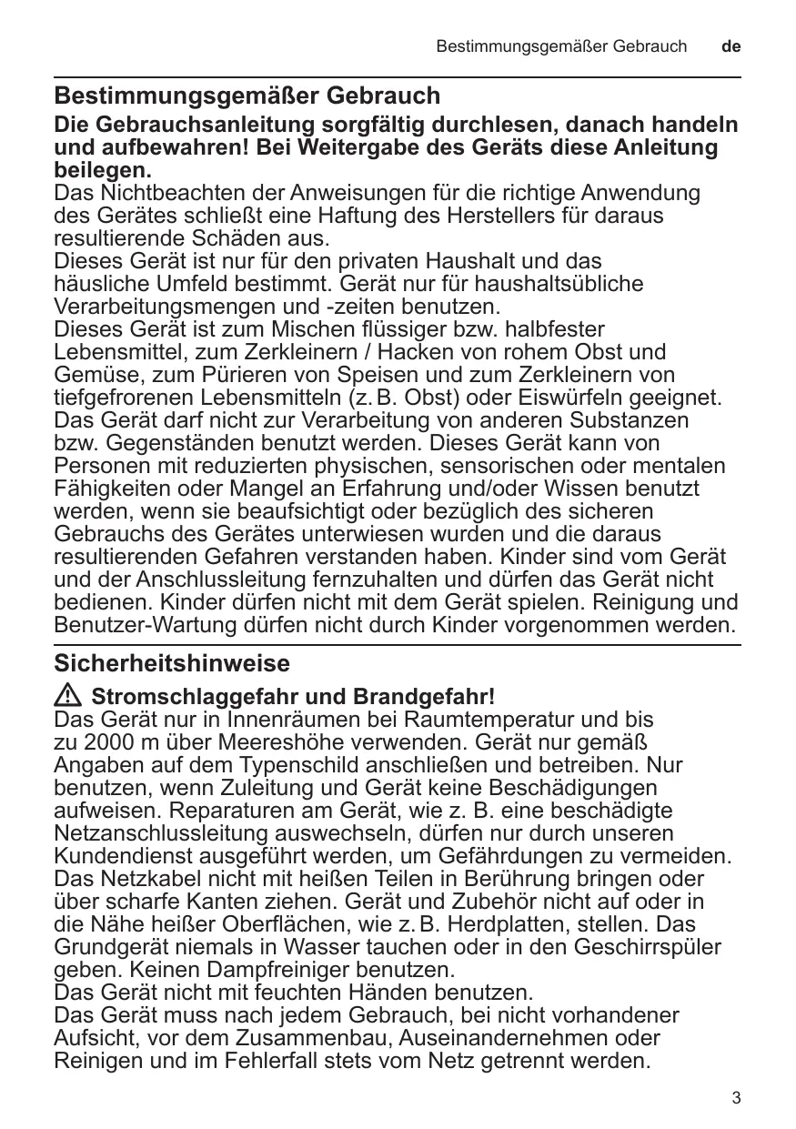 Die Gebrauchsanleitung sorgfältig durchlesen, danach handeln und aufbewahren! Bei Weitergabe des Geräts diese Anleitung beilegen. Das Nichtbeachten der Anweisungen für die richtige Anwendung des Gerätes schließt eine Haftung des Herstellers für daraus resultierende Schäden aus. Dieses Gerät ist nur für den privaten Haushalt und das häusliche Umfeld bestimmt. Gerät nur für haushaltsübliche Verarbeitungsmengen und -zeiten benutzen. Dieses Gerät ist zum Mischen flüssiger bzw. halbfester Lebensmittel, zum Zerkleinern / Hacken von rohem Obst und Gemüse, zum Pürieren von Speisen und zum Zerkleinern von tiefgefrorenen Lebensmitteln (z. B. Obst) oder Eiswürfeln geeignet. Das Gerät darf nicht zur Verarbeitung von anderen Substanzen bzw. Gegenständen benutzt werden. Dieses Gerät kann von Personen mit reduzierten physischen, sensorischen oder mentalen Fähigkeiten oder Mangel an Erfahrung und/oder Wissen benutzt werden, wenn sie beaufsichtigt oder bezüglich des sicheren Gebrauchs des Gerätes unterwiesen wurden und die daraus resultierenden Gefahren verstanden haben. Kinder sind vom Gerät und der Anschlussleitung fernzuhalten und dürfen das Gerät nicht bedienen. Kinder dürfen nicht mit dem Gerät spielen. Reinigung und Benutzer-Wartung dürfen nicht durch Kinder vorgenommen werden.