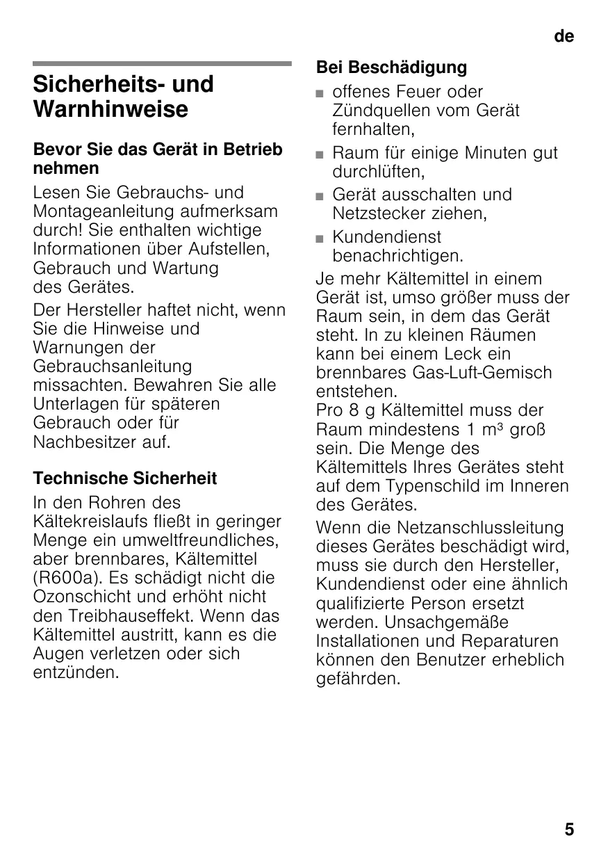 Sicherheits- und Warnhinweise Bevor Sie das Gerät in Betrieb nehmen Lesen Sie Gebrauchs- und Montageanleitung aufmerksam durch! Sie enthalten wichtige Informationen über Aufstellen, Gebrauch und Wartung des Gerätes. Der Hersteller haftet nicht, wenn Sie die Hinweise und Warnungen der Gebrauchsanleitung missachten. Bewahren Sie alle Unterlagen für späteren Gebrauch oder für Nachbesitzer auf. Technische Sicherheit In den Rohren des Kältekreislaufs fließt in geringer Menge ein umweltfreundliches, aber brennbares, Kältemittel (R600a). Es schädigt nicht die Ozonschicht und erhöht nicht den Treibhauseffekt. Wenn das Kältemittel austritt, kann es die Augen verletzen oder sich entzünden.
