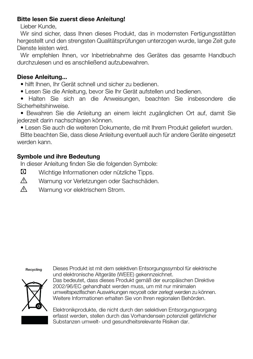 Verwendung des Gerätes unterwiesen wurden. Nehmen Sie einen beschädigten Zum Abtauen des Gerätes ziehen Sie den Netzstecker oder schalten die Pour cette raison, nous vous conseillons de lire attentivement tout le manuel d’utilisation de votre produit avant de vous en servir, et de le conserver ensuite pour une utilisation ultérieure. Le présent manuel • Vous aidera à utiliser votre produit avec rapidité et sécurité. • Lisez le manuel avant d’installer et de faire fonctionner votre produit. • Respectez les instructions, notamment celles relatives à la sécurité. • Conservez ce manuel dans un endroit facilement accessible car vous pouvez en avoir besoin ultérieurement. • En plus, lisez également les autres documents fournis avec votre produit. Veuillez noter que ce manuel peut également être valide pour d’autres modèles. Symboles et descriptions Vous retrouverez les symboles suivants dans le présent manuel : C Informations importantes ou astuces. A Avertissement relatif aux conditions dangereuses pour la vie et la propriété. B Avertissement relatif à la tension électrique.