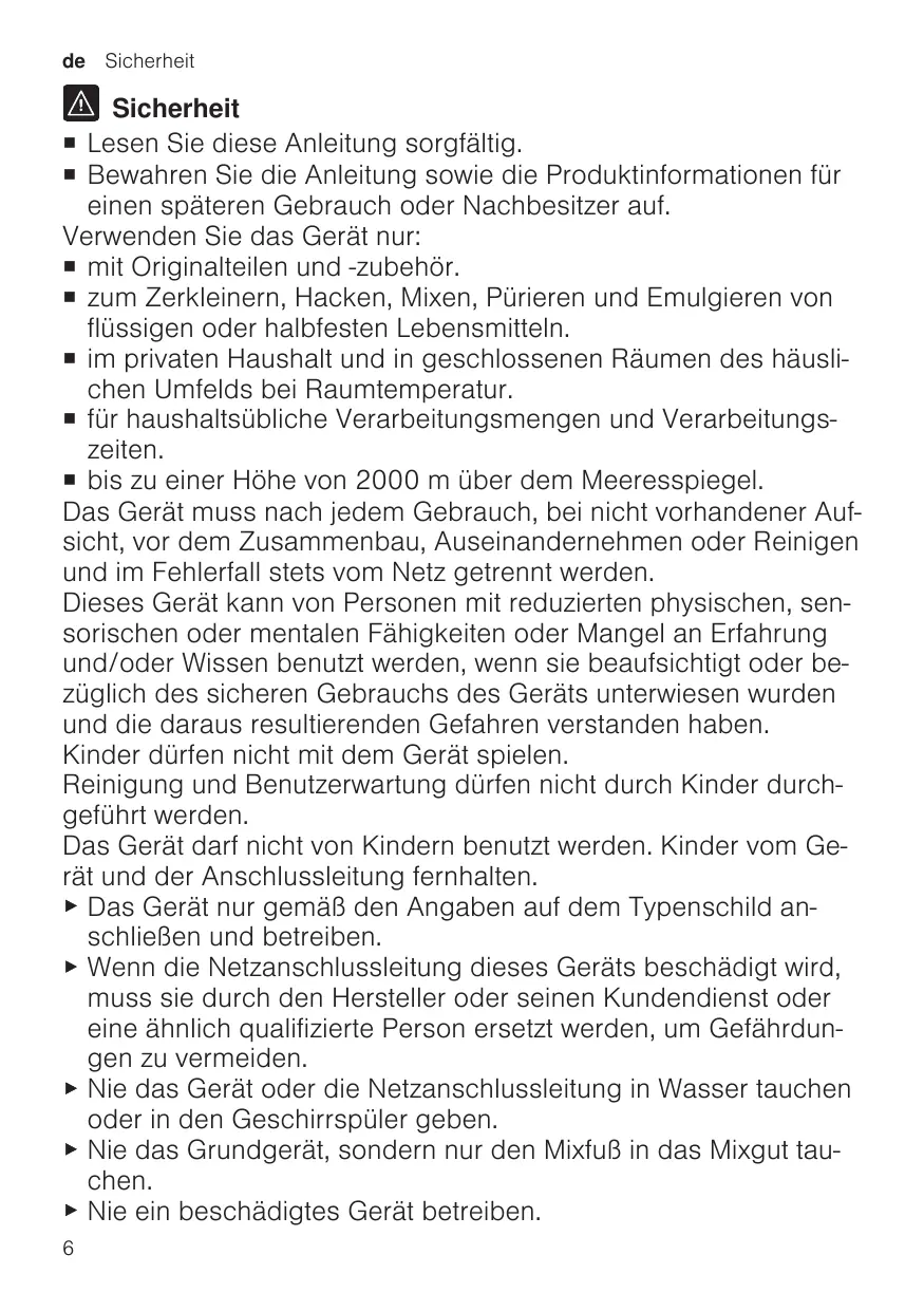 ¡ Read this instruction manual carefully. ¡ Keep the instruction manual and the product information safe for future reference or for the next owner. ¡ pour broyer, hacher, mixer, réduire en purée et émulsionner des produits alimentaires liquides ou mi-ferme. ¡ pour un usage domestique privé et dans les pièces fermées d’un domicile, à la température ambiante. ¡ pour les quantités de préparation et durées de traitement habituelles pour un ménage. ¡ à une hauteur maximale de 2000 m au-dessus du niveau de la mer. L’appareil doit toujours être débranché du secteur, après chaque utilisation, lorsqu’il n’est pas sous surveillance, lorsqu’il doit être monté ou démonté, avant de le nettoyer et en cas de panne. Cet appareil peut être utilisé par des personnes aux capacités physiques, sensorielles ou mentales réduites ou des personnes inexpérimentées, à condition qu'elles soient surveillées ou qu'elles aient été informées de l'utilisation de l'appareil et qu'elles comprennent les risques inhérents à son usage. Les enfants ne sont pas autorisés à jouer avec l'appareil. Le nettoyage et l’entretien de l'appareil ne doivent pas être effectués par des enfants. L'appareil ne doit pas être utilisé par des enfants. Les enfants doivent être tenus à distance de l’appareil et du cordon d’alimentation secteur. ▶ Pour le raccordement et l’utilisation de l’appareil, respectez impérativement les indications figurant sur la plaque signalétique. ▶ Afin d’écarter tout danger quand le cordon d’alimentation secteur de cet appareil est endommagé, seul le fabricant ou son service après-vente ou toute autre personne de qualification équivalente est habilité à le remplacer. ▶ Ne jamais plonger l’appareil ou le cordon d’alimentation secteur dans l’eau et ne pas les mettre au lave-vaisselle. 13