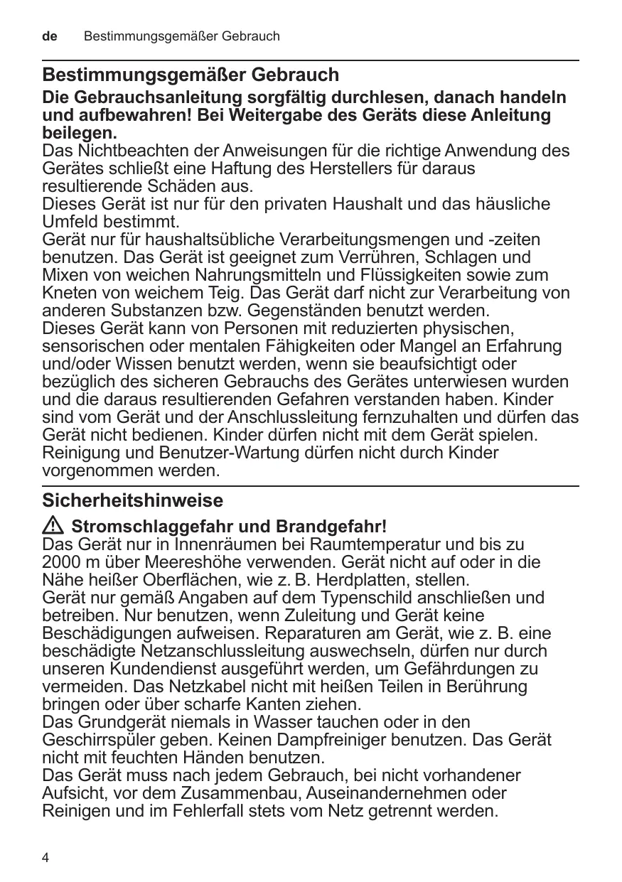 Gerät niemals an Zeitschaltuhren oder fernbedienbaren Steckdosen anschließen. Bei Stromunterbrechung bleibt das Gerät eingeschaltet und läuft nach der Unterbrechung wieder an. Gerät sofort ausschalten. Das Gerät während des Betriebs stets beaufsichtigen! Das Gerät niemals länger eingeschaltet lassen, wie für die Cet appareil est destiné exclusivement à une utilisation domestique et non professionnelle. Utiliser cet appareil uniquement pour des quantités de préparations culinaires courantes et pour des durées de service normales. L’appareil est conçu pour mélanger, battre et mixer des aliments tendres et des liquides ainsi que pour pétrir des pâtes molles. L’appareil ne doit pas servir à transformer d’autres substances ou objets. Cet appareil peut être utilisé par des personnes aux capacités physiques, sensorielles ou mentales réduites ou des personnes inexpérimentées, à condition qu’elles soient surveillées ou qu’elles aient été informées de l’utilisation sûre de l’appareil et qu’elles comprennent les risques inhérents à son usage. Il faut tenir les enfants à l’écart de l’appareil et du cordon de branchement et ne pas leur permettre d’utiliser l’appareil. Ne pas laisser les enfants jouer avec l’appareil. Le nettoyage et l’entretien incombant à l’utilisateur ne doivent pas être effectués par des enfants.
