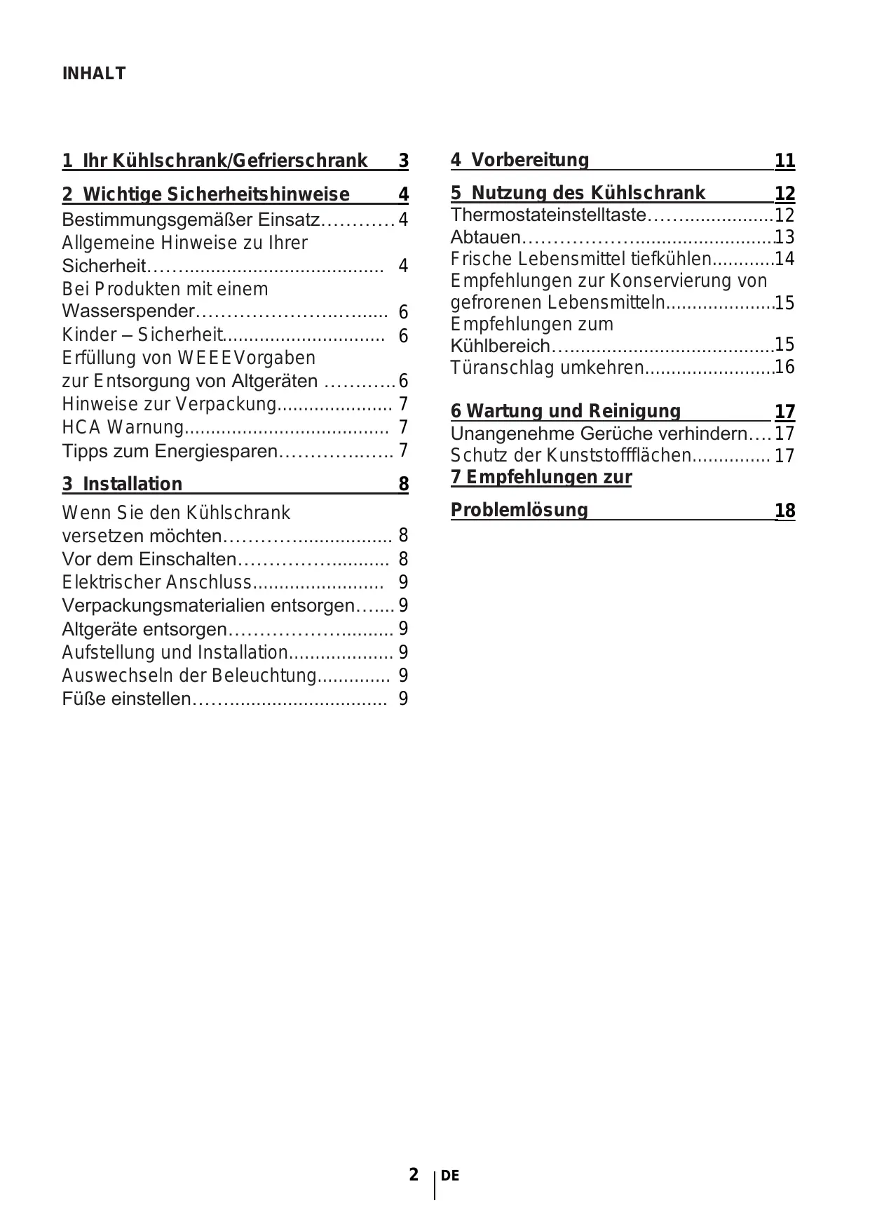 2 Wichtige Sicherheitshinweise 45 Bestimmungsgemäßer Einsatz………… 4 Allgemeine Hinweise zu Ihrer Sicherheit…… 4 Bei Produkten mit einem Wasserspender…………………..… 6 Kinder – Sicherheit 6 Erfüllung von WEEEVorgaben zur Entsorgung von Altgeräten …….….. 6 Hinweise zur Verpackung 7 HCA Warnung 7 Tipps zum Energiesparen…………..….. 7 8 3 Installation 9 Wenn Sie den Kühlschrank versetzen möchten………… 8 Vor dem Einschalten…………… 8 Elektrischer Anschluss 9 Verpackungsmaterialien entsorgen….... 9 Altgeräte entsorgen……………… 9 Aufstellung und Installation 9 Auswechseln der Beleuchtung 9 Füße einstellen…… 9