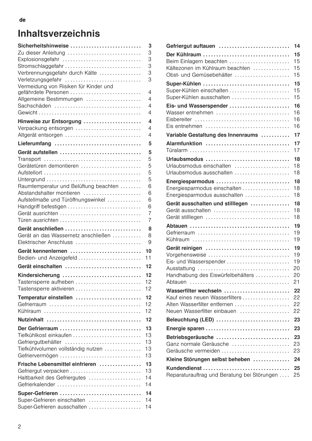 Variable Gestaltung des Innenraums . . . . . . . . . . . 17 Alarmfunktion . . . . . . . . . . . . . . . . . . . . . . . . . . . . . . . . 17 Türalarm . . . . . . . . . . . . . . . . . . . . . . . . . . . . . . . . . . . . . . 17 Urlaubsmodus . . . . . . . . . . . . . . . . . . . . . . . . . . . . . . . . 18 Urlaubsmodus einschalten . . . . . . . . . . . . . . . . . . . . . 18 Urlaubsmodus ausschalten . . . . . . . . . . . . . . . . . . . . . 18 Energiesparmodus . . . . . . . . . . . . . . . . . . . . . . . . . . . . 18 Energiesparmodus einschalten . . . . . . . . . . . . . . . . . . 18 Energiesparmodus ausschalten . . . . . . . . . . . . . . . . . 18 Gerät ausschalten und stilllegen . . . . . . . . . . . . . . . 18 Gerät ausschalten . . . . . . . . . . . . . . . . . . . . . . . . . . . . . 18 Gerät stilllegen . . . . . . . . . . . . . . . . . . . . . . . . . . . . . . . . 18 Abtauen . . . . . . . . . . . . . . . . . . . . . . . . . . . . . . . . . . . . . . 19 Gefrierraum . . . . . . . . . . . . . . . . . . . . . . . . . . . . . . . . . . . 19 Kühlraum . . . . . . . . . . . . . . . . . . . . . . . . . . . . . . . . . . . . . 19 Gerät reinigen . . . . . . . . . . . . . . . . . . . . . . . . . . . . . . . . Vorgehensweise . . . . . . . . . . . . . . . . . . . . . . . . . . . . . . . Eis- und Wasserspender . . . . . . . . . . . . . . . . . . . . . . . . Ausstattung . . . . . . . . . . . . . . . . . . . . . . . . . . . . . . . . . . . Handhabung des Eiswürfelbehälters . . . . . . . . . . . . . Abtauen . . . . . . . . . . . . . . . . . . . . . . . . . . . . . . . . . . . . . .