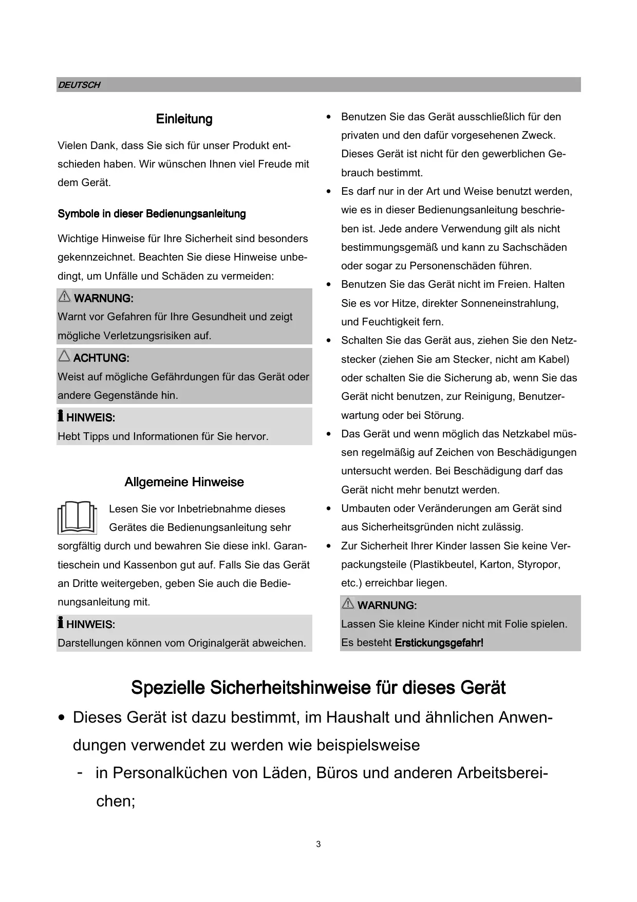 • Benutzen Sie das Gerät ausschließlich für den Einleitung privaten und den dafür vorgesehenen Zweck. Vielen Dank, dass Sie sich für unser Produkt ent- Dieses Gerät ist nicht für den gewerblichen Ge- schieden haben. Wir wünschen Ihnen viel Freude mit brauch bestimmt. dem Gerät.