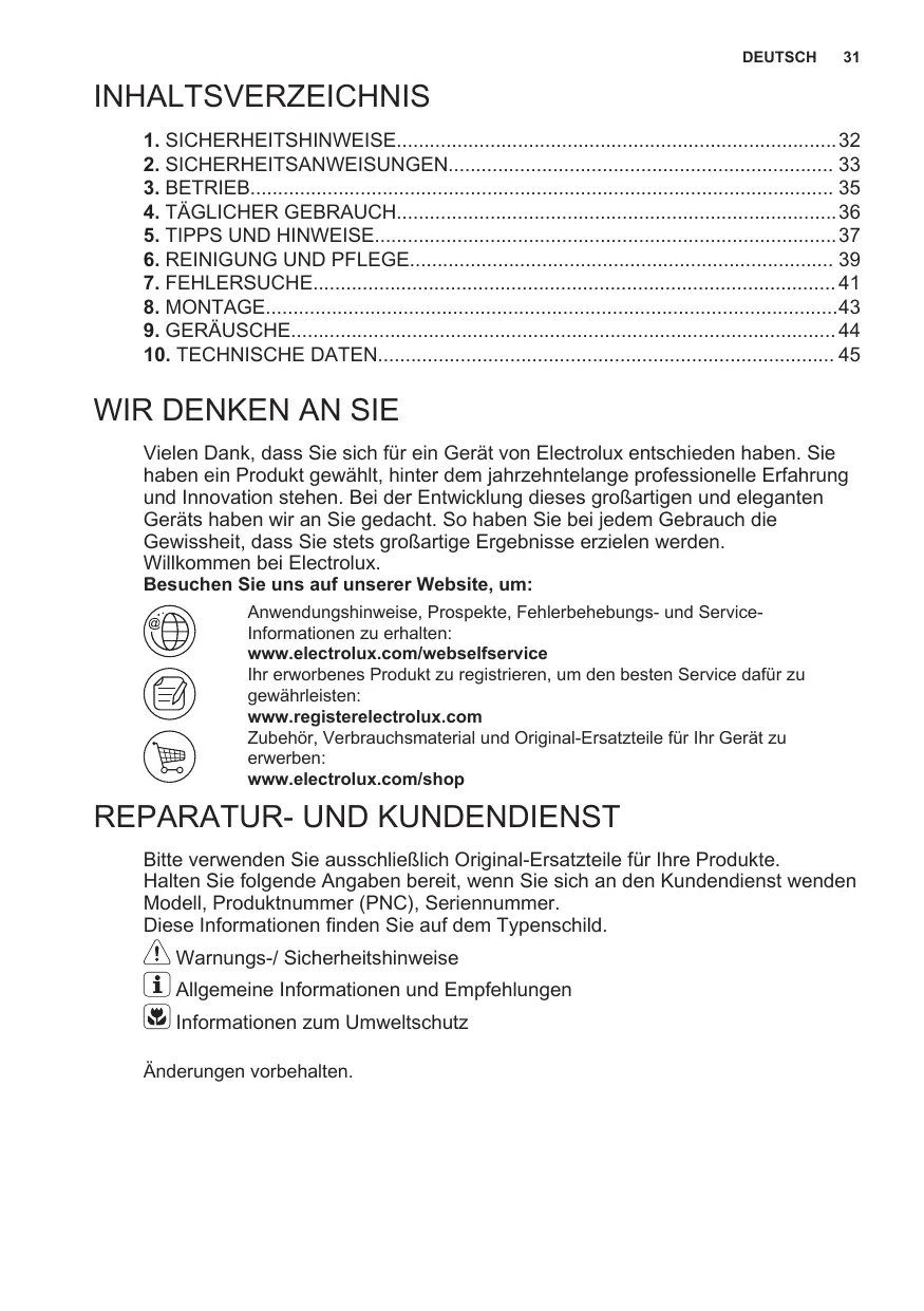 SERVICE APRÈS-VENTE N'utilisez que des pièces de rechange d'origine. Avant de contacter le service, assurez-vous de disposer des informations suivantes : Modèle, PNC, numéro de série. Vous trouverez ces informations sur la plaque signalétique. Avertissement/Attention : consignes de sécurité. Informations générales et conseils. Informations en matière de protection de l'environnement. Sous réserve de modifications.