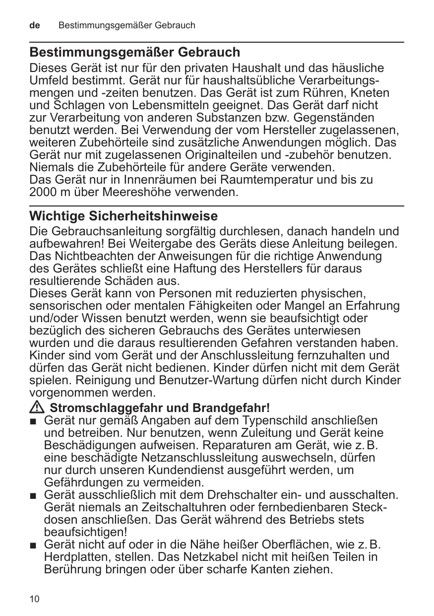 ■ Ne jamais plonger l’appareil de base dans l’eau ou le mettre dans un lave-vaisselle. Ne jamais utiliser de nettoyeur à vapeur. Ne pas utiliser l’appareil avec les mains humides. ■ L’appareil doit toujours être débranché du secteur, après chaque utilisation, lorsqu’il n’est pas sous surveillance, lorsqu’il doit être monté ou démonté, avant de le nettoyer et en cas de panne. W Risques de blessures ! ■ L’appareil doit être éteint et débranché du secteur avant de procéder au changement d’accessoires ou de pièces complémentaires mobiles en fonctionnement. Après extinction de l’appareil, son moteur continue de tourner brièvement. Attendre l’arrêt complet de l’entraînement. ■ Ne pas déplacer le bras pivotant lorsque l’appareil est allumé. ■ Exploiter les ustensiles uniquement lorsque le bol, son couvercle ainsi que les couvercles de protection des entraînements sont mis en place ! Lors de l’utilisation d’ustensiles, monter le bol, son couvercle et les couvercles de protection des entraînements conformément à la notice ! ■ Pendant le fonctionnement, ne jamais introduire les mains dans le bol ni dans l’ouverture pour ajout. Ne pas introduire d’objet (p. ex. cuillère en bois) dans le bol ni dans l’ouverture pour ajout. Tenir les mains, les cheveux, les vêtements et autres ustensiles à distance des pièces en rotation. ■ Ne jamais utiliser simultanément des ustensiles et accessoires ni 2 accessoires. Lors de l’utilisation des accessoires, respecter aussi bien la présente notice que les notices d’utilisation jointes. ■ Utiliser uniquement l’accessoire à l’état entièrement assemblé. Ne jamais assembler les accessoires sur l’appareil de base. Utiliser uniquement l’accessoire dans la position de travail prévue. ■ N’approchez pas les doigts des lames et des arêtes, tranchantes, des disques à réduire. Ne saisissez les disques à réduire que par leurs bords ! ■ Ne touchez pas les lames du mixeur avec les mains nues. ■ Ne jamais introduire les doigts dans le mixeur en place ! Ne jamais exploiter l’appareil sans couvercle. 34