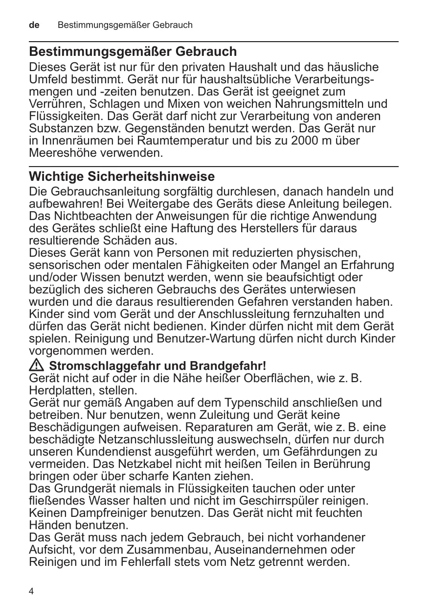 W Risque de chocs électriques et d’incendie Ne pas poser l’appareil sur des surfaces chaudes (tables de cuisson par ex.) ou à proximité de celles-ci. Brancher et utiliser l’appareil uniquement en conformité avec les indications figurant sur la plaque signalétique. N’utiliser l’appareil que si son cordon d’alimentation et l’appareil lui-même ne présentent aucun dommage. Afin d’écarter tout danger, seul notre service après-vente est habilité à réparer l’appareil, comme par exemple, procéder au remplacement d’un cordon d’alimentation endommagé. Ne pas mettre le cordon d’alimentation en contact avec des éléments brûlants et ne pas le faire glisser sur des arêtes vives. Ne jamais plonger l’appareil de base dans des liquides, ne jamais le tenir sous l’eau du robinet et ne pas le laver au lave-vaisselle. Ne jamais utiliser de nettoyeur à vapeur. Ne pas utiliser l’appareil avec les mains humides. 13