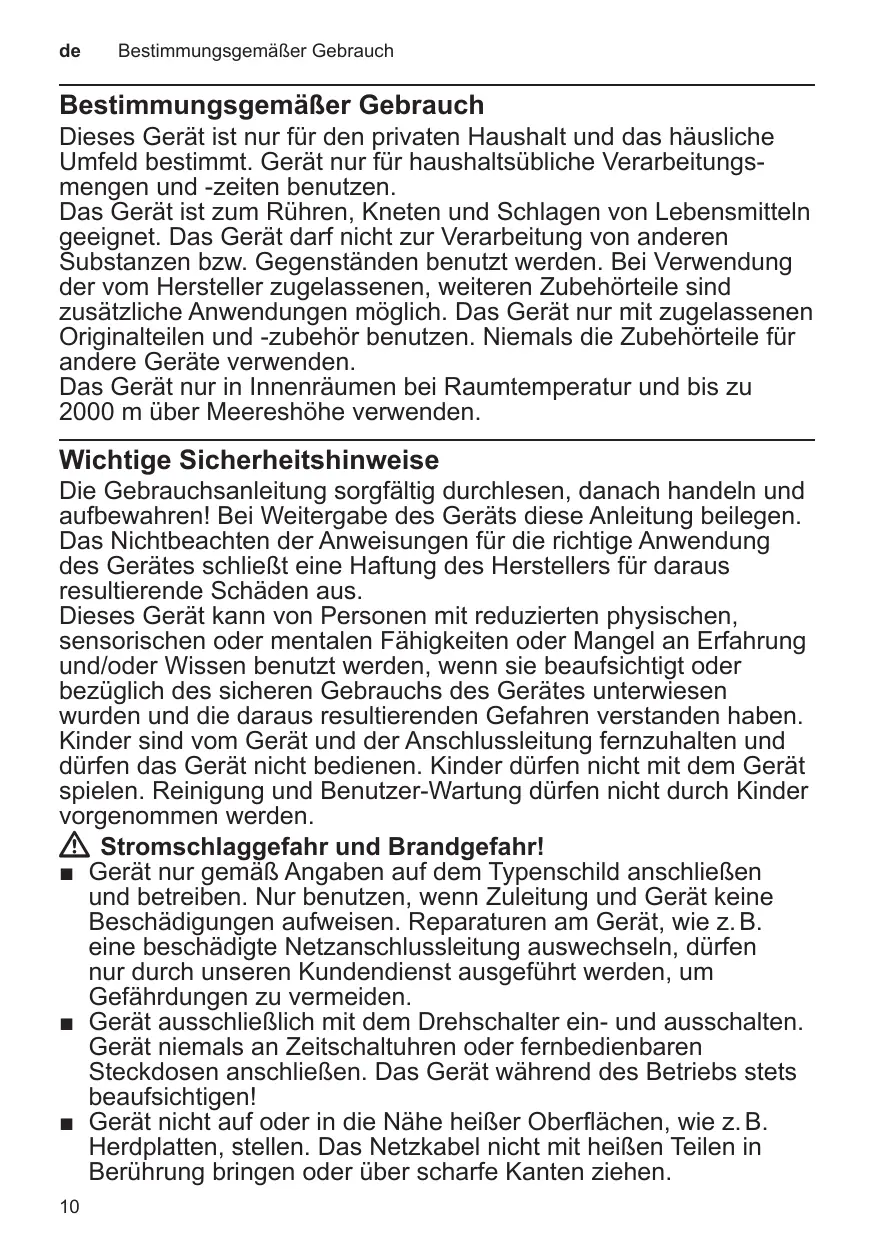 ■ L’appareil doit toujours être débranché du secteur, après chaque utilisation, lorsqu’il n’est pas sous surveillance, lorsqu’il doit être monté ou démonté, avant de le nettoyer et en cas de panne. W Risques de blessures ! ■ L’appareil doit être éteint et débranché du secteur avant de procéder au changement d’accessoires ou de pièces complémentaires mobiles en fonctionnement. Après extinction de l’appareil, son moteur continue de tourner brièvement. Attendre l’arrêt complet de l’entraînement. ■ Ne pas déplacer le bras pivotant lorsque l’appareil est allumé. ■ Exploiter les ustensiles uniquement lorsque le bol, son couvercle ainsi que les couvercles de protection des entraînements sont mis en place ! Lors de l’utilisation d’ustensiles, monter le bol, son couvercle et les couvercles de protection des entraînements conformément à la notice ! ■ Pendant le fonctionnement, ne jamais introduire les mains dans le bol ni dans l’ouverture pour ajout. Ne pas introduire d’objet (p. ex. cuillère en bois) dans le bol ni dans l’ouverture pour ajout. Tenir les mains, les cheveux, les vêtements et autres ustensiles à distance des pièces en rotation. ■ Ne jamais utiliser simultanément des ustensiles et accessoires ni 2 accessoires. Lors de l’utilisation des accessoires, respecter aussi bien la présente notice que les notices d’utilisation jointes. ■ Utiliser uniquement l’accessoire à l’état entièrement assemblé. Ne jamais assembler les accessoires sur l’appareil de base. Utiliser uniquement l’accessoire dans la position de travail prévue. ■ N’approchez pas les doigts des lames et des arêtes, tranchantes, des disques à réduire. Ne saisissez les disques à réduire que par leurs bords ! ■ Ne touchez pas les lames du mixeur avec les mains nues. ■ Ne jamais introduire les doigts dans le mixeur en place ! Ne jamais exploiter l’appareil sans couvercle. ■ Attention quand vous manipulez les lames acérées lors du vidage du récipient ou de son nettoyage.