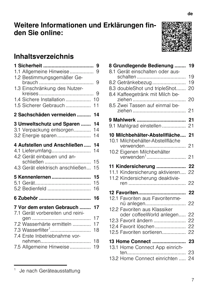 Weitere Informationen und Erklärungen finden Sie online: Inhaltsverzeichnis 1 Sicherheit 9 1.1 Allgemeine Hinweise 9 1.2 Bestimmungsgemäßer Gebrauch 9 1.3 Einschränkung des Nutzerkreises 9 1.4 Sichere Installation 10 1.5 Sicherer Gebrauch 11 2 Sachschäden vermeiden 14 3 Umweltschutz und Sparen 14 3.1 Verpackung entsorgen 14 3.2 Energie sparen 14 4 Aufstellen und Anschließen 4.1 Lieferumfang 4.2 Gerät einbauen und anschließen 4.3 Gerät elektrisch anschließen...
