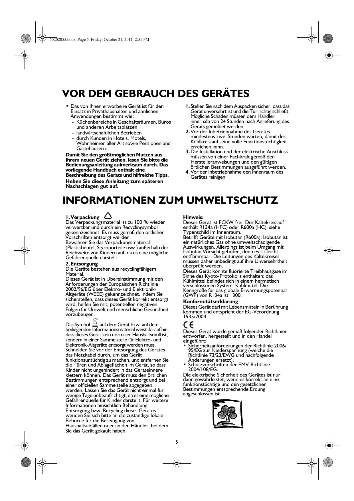 Die Geräte bestehen aus recyclingfähigem Material. Dieses Gerät ist in Übereinstimmung mit den Anforderungen der Europäischen Richtlinie 2002/96/EG über Elektro- und ElektronikAltgeräte (WEEE) gekennzeichnet. Indem Sie sicherstellen, dass dieses Gerät korrekt entsorgt wird, helfen Sie mit, potentiellen negativen Folgen für Umwelt und menschliche Gesundheit vorzubeugen. Hinweis: Dieses Gerät ist FCKW-frei. Der Kältekreislauf enthält R134a (HFC) oder R600a (HC), siehe Typenschild im Innenraum. Betrifft Geräte mit Isobutan (R600a): Isobutan ist ein natürliches Gas ohne umweltschädigende Auswirkungen. Allerdings ist beim Umgang mit Isobutan Vorsicht geboten, denn es ist leicht entflammbar. Die Leitungen des Kältekreises müssen daher unbedingt auf ihre Unversehrtheit überprüft werden. Dieses Gerät könnte fluorierte Treibhausgase im Sinne des Kyoto-Protokolls enthalten; das Kühlmittel befindet sich in einem hermetisch verschlossenen System. Kühlmittel: Die Kenngröße für das globale Erwärmungspotential (GWP) von R134a ist 1300. Konformitätserklärung Dieses Gerät darf mit Lebensmitteln in Berührung kommen und entspricht der EG-Verordnung 1935/2004. Das Symbol auf dem Gerät bzw. auf dem beiliegenden Informationsmaterial weist darauf hin, dass dieses Gerät kein normaler Haushaltsmüll ist, sondern in einer Sammelstelle für Elektro- und Elektronik-Altgeräte entsorgt werden muss. Schneiden Sie vor der Entsorgung des Gerätes das Netzkabel durch, um das Gerät funktionsuntüchtig zu machen, und entfernen Sie die Türen und Ablageflächen im Gerät, so dass Kinder nicht ungehindert in das Geräteinnere klettern können. Das Gerät muss den örtlichen Bestimmungen entsprechend entsorgt und bei einer offiziellen Sammelstelle abgegeben werden. Lassen Sie das Gerät nicht einmal für wenige Tage unbeaufsichtigt, da es eine mögliche Gefahrenquelle für Kinder darstellt. Für weitere Informationen hinsichtlich Behandlung, Entsorgung bzw. Recycling dieses Gerätes wenden Sie sich bitte an die zuständige lokale Behörde für die Beseitigung von Haushaltsabfällen oder an den Händler, bei dem Sie das Gerät gekauft haben. Dieses Gerät wurde gemäß folgender Richtlinien entworfen, hergestellt und in den Handel eingeführt: