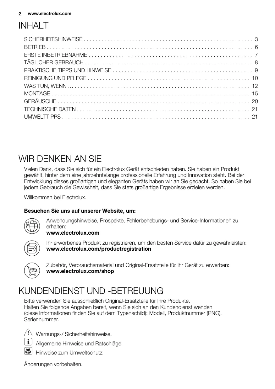 WIR DENKEN AN SIE Vielen Dank, dass Sie sich für ein Electrolux Gerät entschieden haben. Sie haben ein Produkt gewählt, hinter dem eine jahrzehntelange professionelle Erfahrung und Innovation steht. Bei der Entwicklung dieses großartigen und eleganten Geräts haben wir an Sie gedacht. So haben Sie bei jedem Gebrauch die Gewissheit, dass Sie stets großartige Ergebnisse erzielen werden. Willkommen bei Electrolux. Besuchen Sie uns auf unserer Website, um: Anwendungshinweise, Prospekte, Fehlerbehebungs- und Service-Informationen zu erhalten: www.electrolux.com Ihr erworbenes Produkt zu registrieren, um den besten Service dafür zu gewährleisten: www.electrolux.com/productregistration Zubehör, Verbrauchsmaterial und Original-Ersatzteile für Ihr Gerät zu erwerben: www.electrolux.com/shop