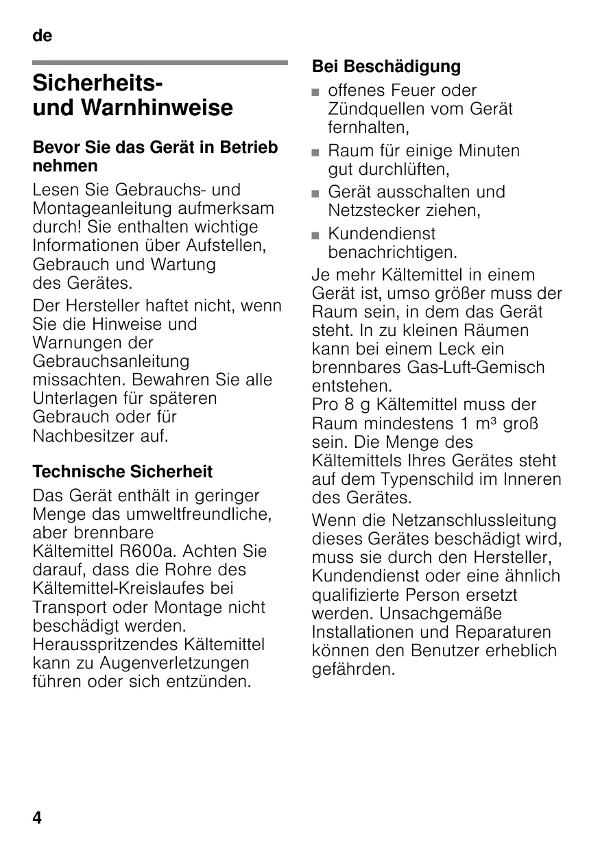 Sicherheits- und Warnhinweise Bevor Sie das Gerät in Betrieb nehmen Lesen Sie Gebrauchs- und Montageanleitung aufmerksam durch! Sie enthalten wichtige Informationen über Aufstellen, Gebrauch und Wartung des Gerätes. Der Hersteller haftet nicht, wenn Sie die Hinweise und Warnungen der Gebrauchsanleitung missachten. Bewahren Sie alle Unterlagen für späteren Gebrauch oder für Nachbesitzer auf. Technische Sicherheit Das Gerät enthält in geringer Menge das umweltfreundliche, aber brennbare Kältemittel R600a. Achten Sie darauf, dass die Rohre des Kältemittel-Kreislaufes bei Transport oder Montage nicht beschädigt werden. Herausspritzendes Kältemittel kann zu Augenverletzungen führen oder sich entzünden. Bei Beschädigung = offenes Feuer oder Zündquellen vom Gerät fernhalten, = Raum für einige Minuten gut durchlüften, = Gerât ausschalten und Netzstecker ziehen, = Kundendienst benachrichtigen. Je mehr Kältemittel in einem Gerät ist, umso grôBer muss der Raum sein, in dem das Gerät steht. In zu kleinen Räumen kann bei einem Leck ein brennbares Gas-Luft-Gemisch entstehen. Pro 8 g Kältemittel muss der Raum mindestens 1 m$ groB sein. Die Menge des Kältemittels Ihres Gerätes steht auf dem Typenschild im Inneren des Gerätes. Wenn die Netzanschlussleitung dieses Gerätes beschädigt wird, muss sie durch den Hersteller, Kundendienst oder eine ähnlich qualifizierte Person ersetzt werden. UnsachgemäBe Installationen und Reparaturen kônnen den Benutzer erheblich gefährden.