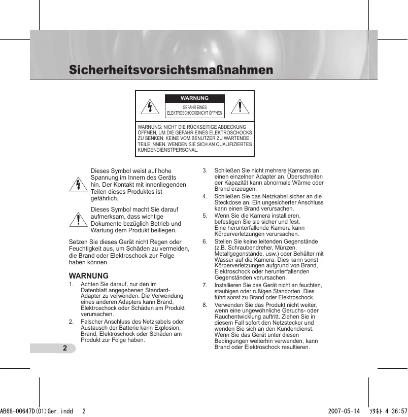 Schließen Sie nicht mehrere Kameras an einen einzelnen Adapter an. Überschreiten der Kapazität kann abnormale Wärme oder Brand erzeugen. Schließen Sie das Netzkabel sicher an die Steckdose an. Ein ungesicherter Anschluss kann einen Brand verursachen. Wenn Sie die Kamera installieren, befestigen Sie sie sicher und fest. Eine herunterfallende Kamera kann Körperverletzungen verursachen. Stellen Sie keine leitenden Gegenstände (z.B. Schraubendreher, Münzen, Metallgegenstände, usw.) oder Behälter mit Wasser auf die Kamera. Dies kann sonst Körperverletzungen aufgrund von Brand, Elektroschock oder herunterfallenden Gegenständen verursachen. Installieren Sie das Gerät nicht an feuchten, staubigen oder rußigen Standorten. Dies führt sonst zu Brand oder Elektroschock. Verwenden Sie das Produkt nicht weiter, wenn eine ungewöhnliche Geruchs- oder Rauchentwicklung auftritt. Ziehen Sie in diesem Fall sofort den Netzstecker und wenden Sie sich an den Kundendienst. Wenn Sie das Gerät unter diesen Bedingungen weiterhin verwenden, kann Brand oder Elektroschock resultieren.