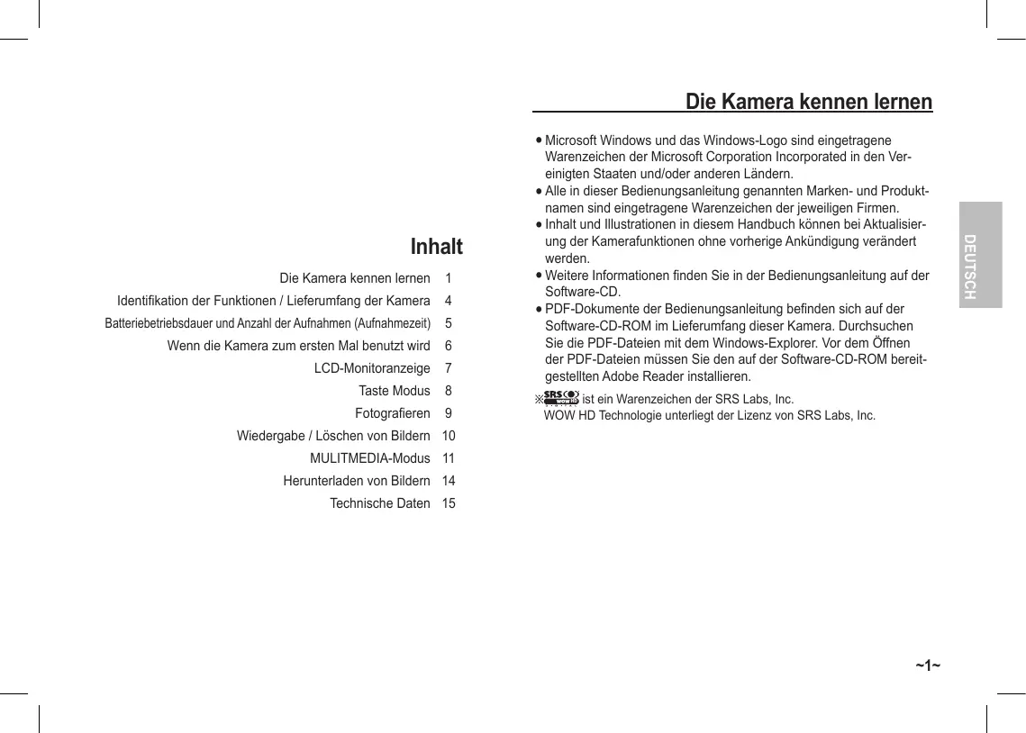 Wiedergabe / Löschen von Bildern 10 MULITMEDIA-Modus 11 Herunterladen von Bildern 14 Technische Daten 15