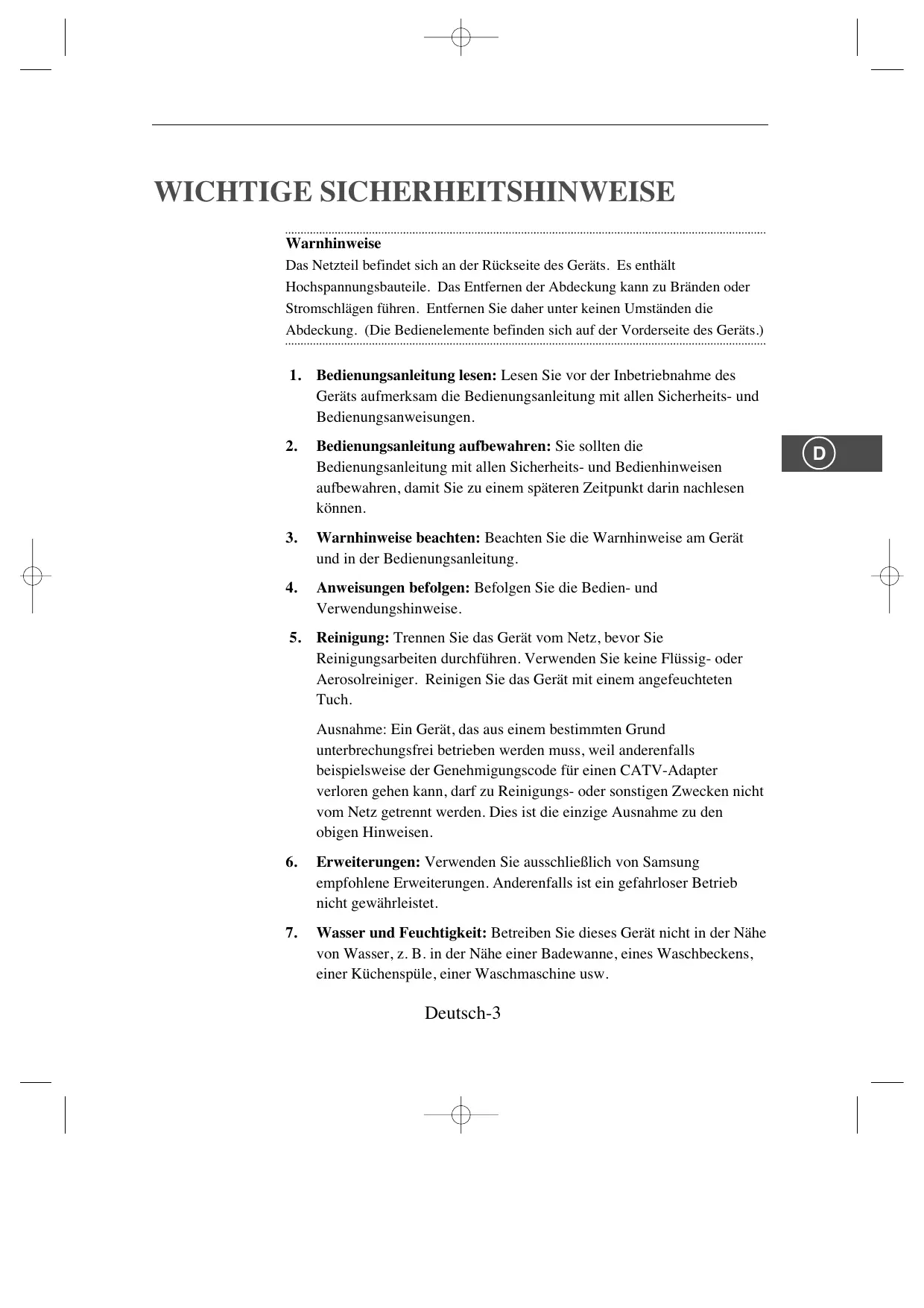 Wasser und Feuchtigkeit: Betreiben Sie dieses Gerät nicht in der Nähe von Wasser, z. B. in der Nähe einer Badewanne, eines Waschbeckens, einer Küchenspüle, einer Waschmaschine usw. Deutsch-3