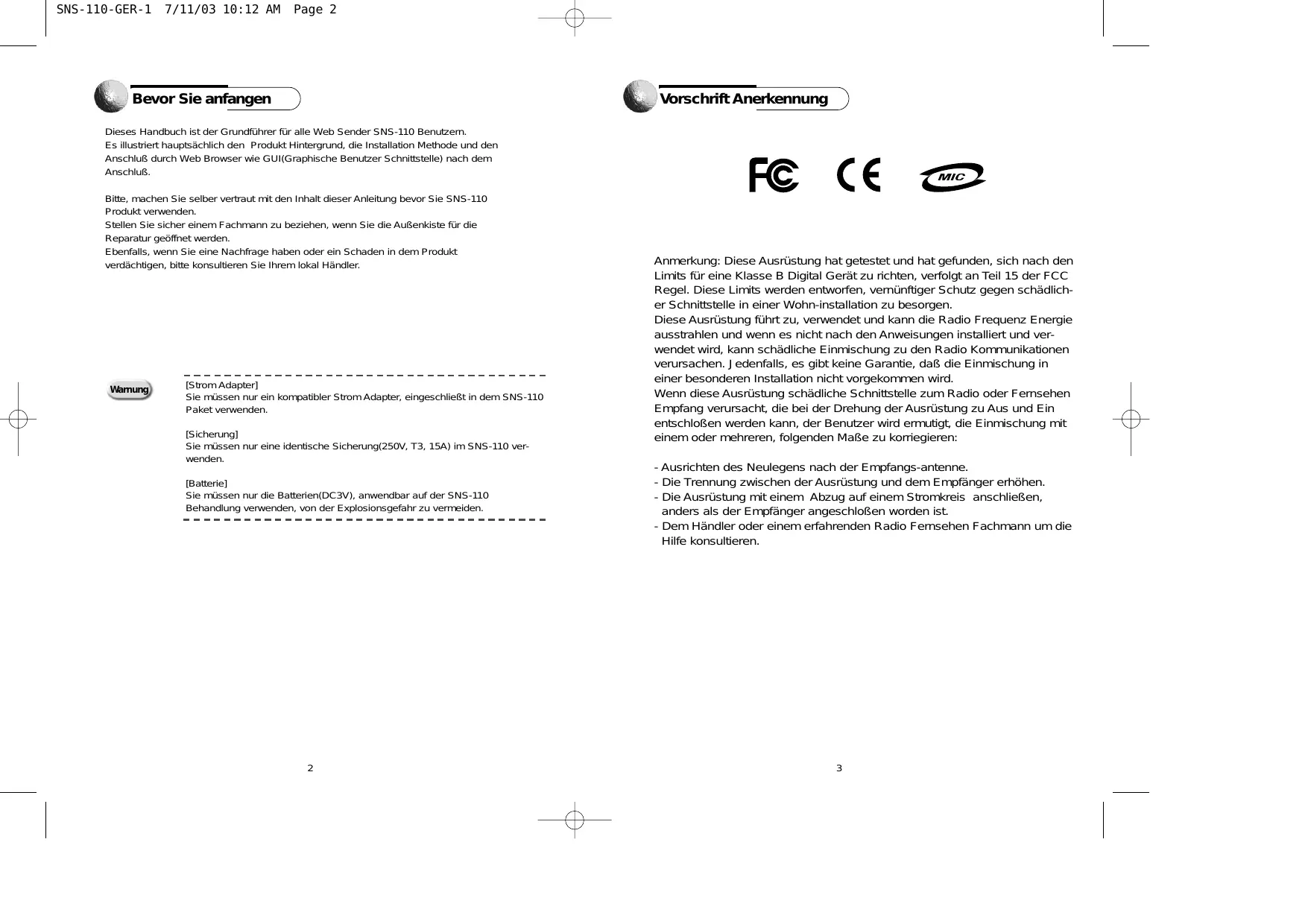 SNS-110-GER-1 7/11/03 10:12 AM Page 2 Bevor Sie anfangen Vorschrift Anerkennung Dieses Handbuch ist der Grundführer für alle Web Sender SNS-110 Benutzern. Es illustriert hauptsächlich den Produkt Hintergrund, die Installation Methode und den Anschluß durch Web Browser wie GUI(Graphische Benutzer Schnittstelle) nach dem Anschluß. Bitte, machen Sie selber vertraut mit den Inhalt dieser Anleitung bevor Sie SNS-110 Produkt verwenden. Stellen Sie sicher einem Fachmann zu beziehen, wenn Sie die Außenkiste für die Reparatur geöffnet werden. Ebenfalls, wenn Sie eine Nachfrage haben oder ein Schaden in dem Produkt verdächtigen, bitte konsultieren Sie Ihrem lokal Händler. Warnung [Strom Adapter] Sie müssen nur ein kompatibler Strom Adapter, eingeschließt in dem SNS-110 Paket verwenden. [Sicherung] Sie müssen nur eine identische Sicherung(250V, T3, 15A) im SNS-110 verwenden. [Batterie] Sie müssen nur die Batterien(DC3V), anwendbar auf der SNS-110 Behandlung verwenden, von der Explosionsgefahr zu vermeiden.