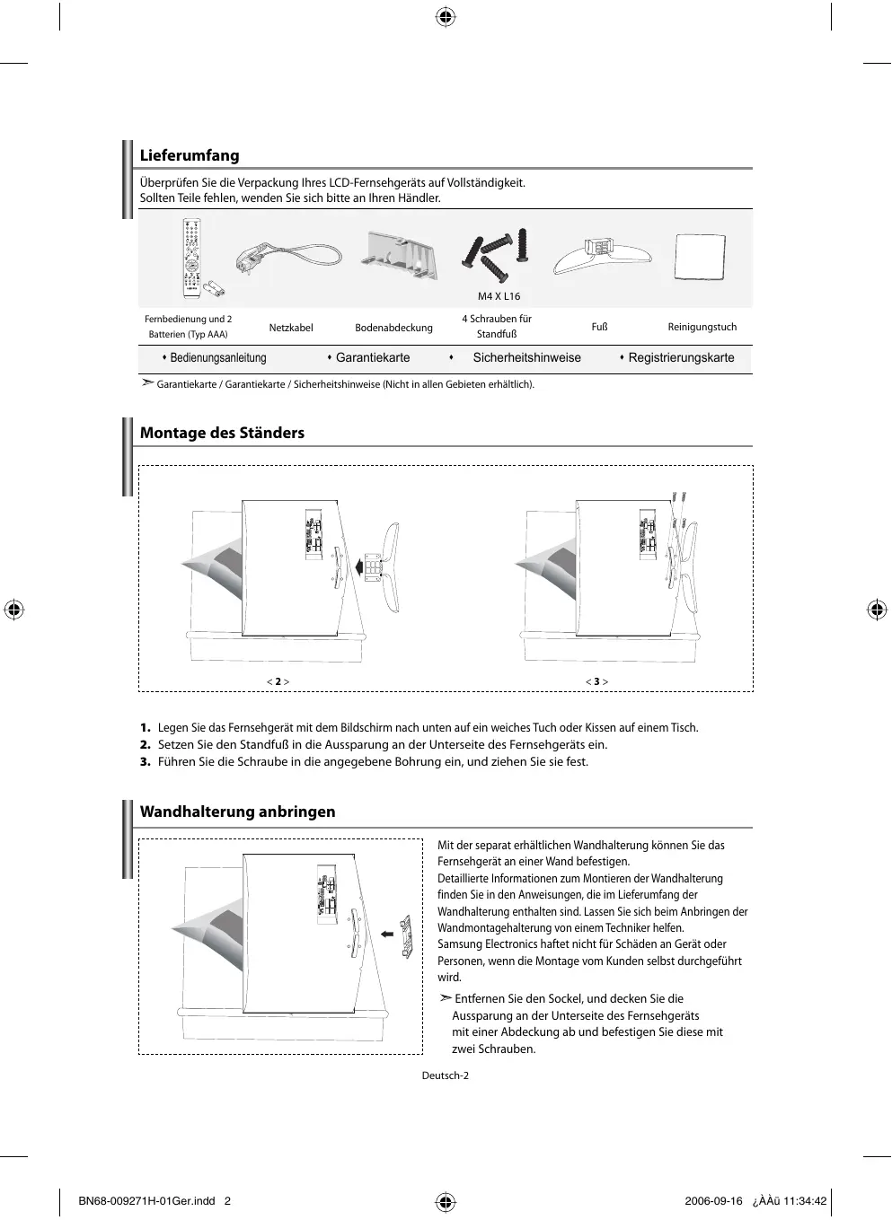 - Anschließen eines Kopfhörers Symbole Tastendruck Wichtig Hinweis Zielwahltaste Deutsch-1 BN68-009271H-01Ger.indd 1 2006-09-16 ¿ÀÀü 11:34:36 Lieferumfang Überprüfen Sie die Verpackung Ihres LCD-Fernsehgeräts auf Vollständigkeit. Sollten Teile fehlen, wenden Sie sich bitte an Ihren Händler. M4 X L16 Fernbedienung und 2 Batterien (Typ AAA) Netzkabel Bedienungsanleitung 4 Schrauben für Standfuß Bodenabdeckung Garantiekarte p. 17