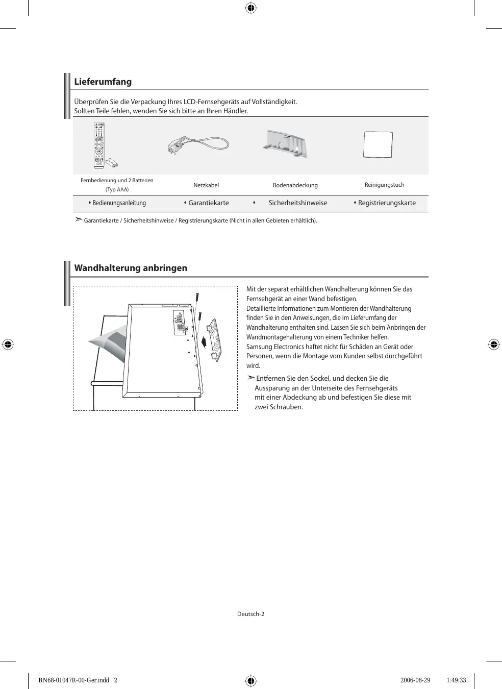 Uhrzeit einstellen und anzeigen......................................... 19 Stellen der Einschlafschaltuhr ............................................. 20 Fernseher automatisch ein- und ausschalten................ 20 Symbole Tastendruck Wichtig Hinweis Zielwahltaste Deutsch-1 BN68-01047R-00-Ger.indd 1 2006-08-29 1:49:27 Lieferumfang Überprüfen Sie die Verpackung Ihres LCD-Fernsehgeräts auf Vollständigkeit. Sollten Teile fehlen, wenden Sie sich bitte an Ihren Händler. Fernbedienung und 2 Batterien Netzkabel (Typ AAA) Bedienungsanleitung Garantiekarte Bodenabdeckung