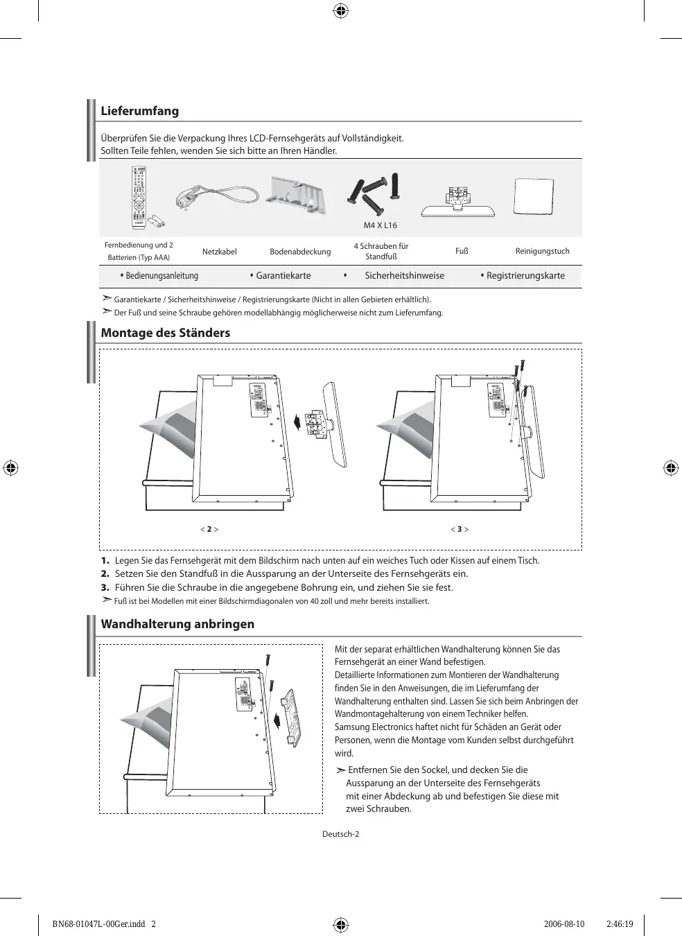 Uhrzeit einstellen und anzeigen......................................... 19 Stellen der Einschlafschaltuhr ............................................. 20 Fernseher automatisch ein- und ausschalten................ 20 Symbole Tastendruck Wichtig Hinweis Zielwahltaste Deutsch-1 BN68-01047L-00Ger.indd 1 2006-08-10 2:46:12 Lieferumfang Überprüfen Sie die Verpackung Ihres LCD-Fernsehgeräts auf Vollständigkeit. Sollten Teile fehlen, wenden Sie sich bitte an Ihren Händler. M4 X L16 Fernbedienung und 2 Batterien (Typ AAA) Netzkabel Bedienungsanleitung 4 Schrauben für Standfuß Bodenabdeckung Garantiekarte