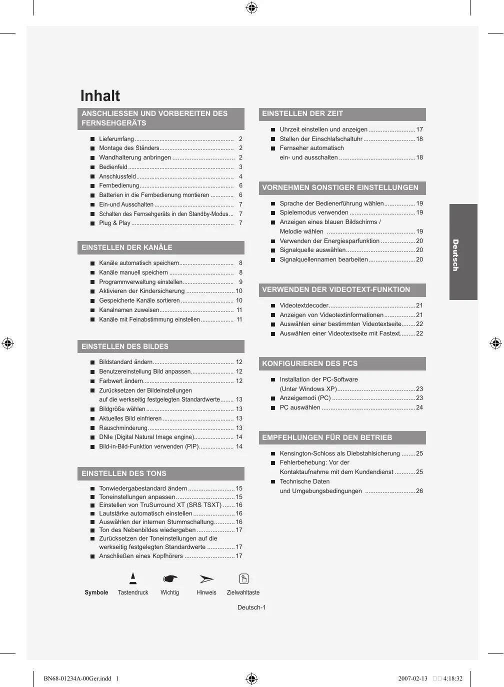 Zum Beenden drücken Sie die Taste EXIT. Deutsch-20 BN68-01234A-00Ger.indd 20 2007-02-13 4:18:53 Videotextdecoder Zusammen mit den meisten Fernsehprogrammen werden Videotextseiten ausgestrahlt. Diese Seiten enthalten unter anderem die folgenden Informationen: Sendezeiten. Nachrichten und Wetterberichte. Sportergebnisse. Untertitel für Hörgeschädigte. Die Videotextseiten sind in sechs Kategorien unterteilt: Teil Inhalt