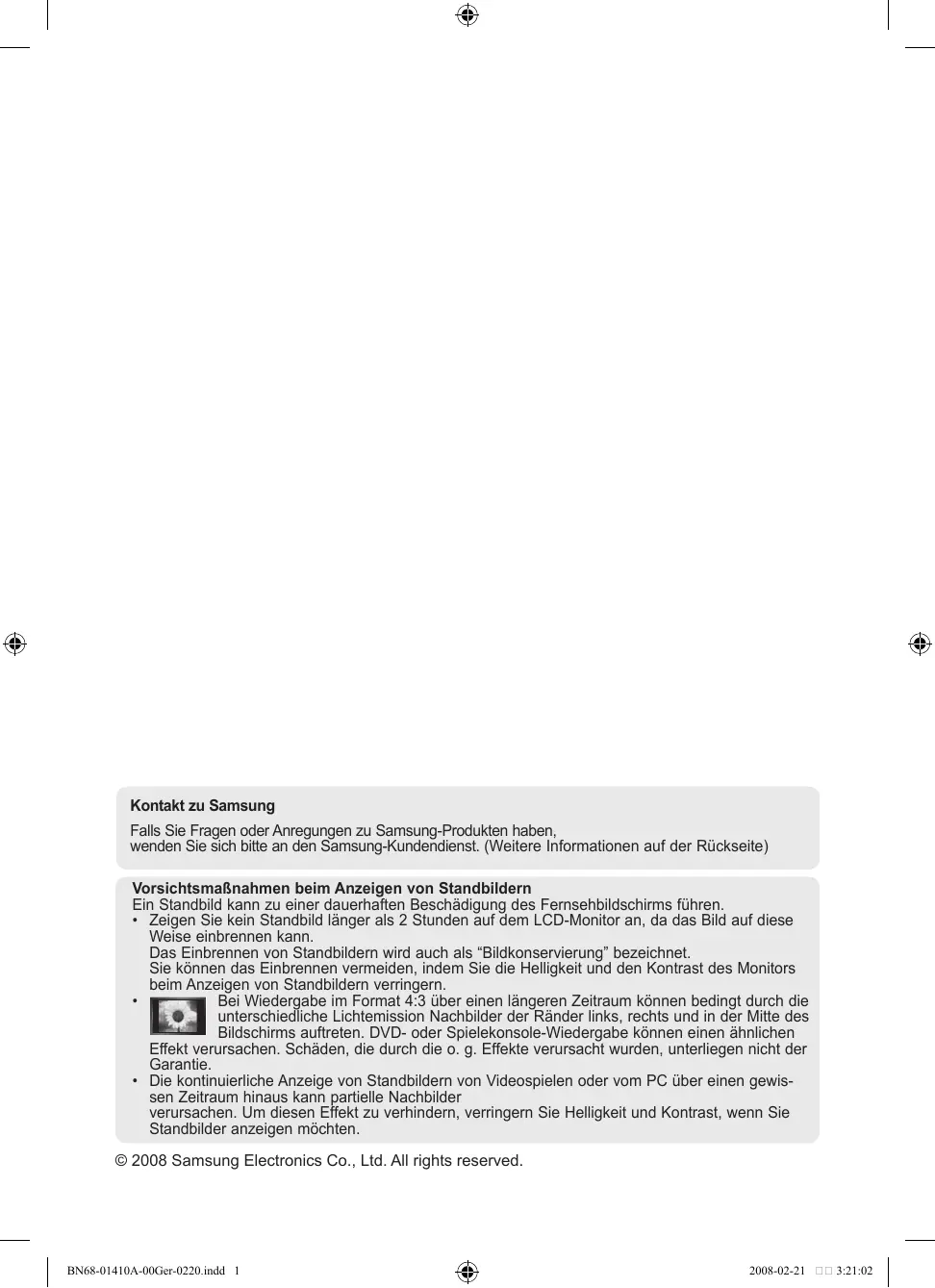 - Die kontinuierliche Anzeige von Standbildern von Videospielen oder vom PC über einen gewissen Zeitraum hinaus kann partielle Nachbilder verursachen. Um diesen Effekt zu verhindern, verringern Sie Helligkeit und Kontrast, wenn Sie Standbilder anzeigen möchten. © 2008 Samsung Electronics Co., Ltd. All rights reserved. BN68-01410A-00Ger-0220.indd 1 2008-02-21 3:21:02 Inhalt