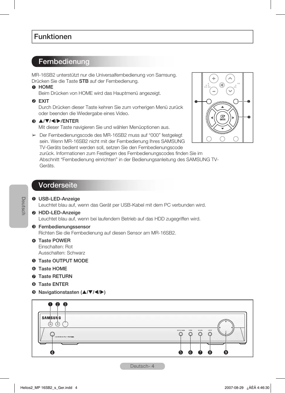 USB-LED-Anzeige Leuchtet blau auf, wenn das Gerät per USB-Kabel mit dem PC verbunden wird. HDD-LED-Anzeige Leuchtet blau auf, wenn bei laufendem Betrieb auf das HDD zugegriffen wird. Fernbedienungssensor Richten Sie die Fernbedienung auf diesen Sensor am MR-16SB2. Taste POWER Einschalten: Rot Ausschalten: Schwarz Taste OUTPUT MODE Taste HOME Taste RETURN Taste ENTER Navigationstasten (///)