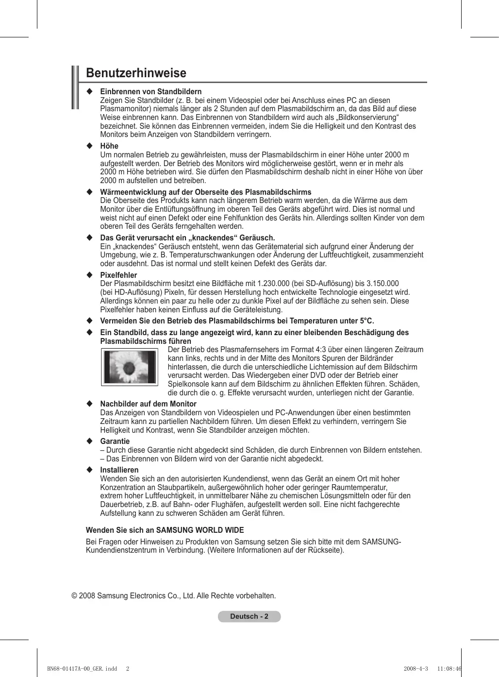 2008-4-2 14:38:24 Benutzerhinweise Einbrennen von Standbildern Zeigen Sie Standbilder (z. B. bei einem Videospiel oder bei Anschluss eines PC an diesen Plasmamonitor) niemals länger als 2 Stunden auf dem Plasmabildschirm an, da das Bild auf diese Weise einbrennen kann. Das Einbrennen von Standbildern wird auch als „Bildkonservierung“ bezeichnet. Sie können das Einbrennen vermeiden, indem Sie die Helligkeit und den Kontrast des Monitors beim Anzeigen von Standbildern verringern. Höhe Um normalen Betrieb zu gewährleisten, muss der Plasmabildschirm in einer Höhe unter 2000 m aufgestellt werden. Der Betrieb des Monitors wird möglicherweise gestört, wenn er in mehr als 2000 m Höhe betrieben wird. Sie dürfen den Plasmabildschirm deshalb nicht in einer Höhe von über 2000 m aufstellen und betreiben. Wärmeentwicklung auf der Oberseite des Plasmabildschirms Die Oberseite des Produkts kann nach längerem Betrieb warm werden, da die Wärme aus dem Monitor über die Entlüftungsöffnung im oberen Teil des Geräts abgeführt wird. Dies ist normal und weist nicht auf einen Defekt oder eine Fehlfunktion des Geräts hin. Allerdings sollten Kinder von dem oberen Teil des Geräts ferngehalten werden. Das Gerät verursacht ein „knackendes“ Geräusch. Ein „knackendes“ Geräusch entsteht, wenn das Gerätematerial sich aufgrund einer Änderung der Umgebung, wie z. B. Temperaturschwankungen oder Änderung der Luftfeuchtigkeit, zusammenzieht oder ausdehnt. Das ist normal und stellt keinen Defekt des Geräts dar. Pixelfehler Der Plasmabildschirm besitzt eine Bildfläche mit 1.230.000 (bei SD-Auflösung) bis 3.150.000 (bei HD-Auflösung) Pixeln, für dessen Herstellung hoch entwickelte Technologie eingesetzt wird. Allerdings können ein paar zu helle oder zu dunkle Pixel auf der Bildfläche zu sehen sein. Diese Pixelfehler haben keinen Einfluss auf die Geräteleistung. Vermeiden Sie den Betrieb des Plasmabildschirms bei Temperaturen unter 5°C. Ein Standbild, dass zu lange angezeigt wird, kann zu einer bleibenden Beschädigung des Plasmabildschirms führen Der Betrieb des Plasmafernsehers im Format 4:3 über einen längeren Zeitraum kann links, rechts und in der Mitte des Monitors Spuren der Bildränder hinterlassen, die durch die unterschiedliche Lichtemission auf dem Bildschirm verursacht werden. Das Wiedergeben einer DVD oder der Betrieb einer Spielkonsole kann auf dem Bildschirm zu ähnlichen Effekten führen. Schäden, die durch die o. g. Effekte verursacht wurden, unterliegen nicht der Garantie. Nachbilder auf dem Monitor Das Anzeigen von Standbildern von Videospielen und PC-Anwendungen über einen bestimmten Zeitraum kann zu partiellen Nachbildern führen. Um diesen Effekt zu verhindern, verringern Sie Helligkeit und Kontrast, wenn Sie Standbilder anzeigen möchten. Garantie – Durch diese Garantie nicht abgedeckt sind Schäden, die durch Einbrennen von Bildern entstehen. – Das Einbrennen von Bildern wird von der Garantie nicht abgedeckt. Installieren Wenden Sie sich an den autorisierten Kundendienst, wenn das Gerät an einem Ort mit hoher Konzentration an Staubpartikeln, außergewöhnlich hoher oder geringer Raumtemperatur, extrem hoher Luftfeuchtigkeit, in unmittelbarer Nähe zu chemischen Lösungsmitteln oder für den Dauerbetrieb, z.B. auf Bahn- oder Flughäfen, aufgestellt werden soll. Eine nicht fachgerechte Aufstellung kann zu schweren Schäden am Gerät führen. Wenden Sie sich an SAMSUNG WORLD WIDE Bei Fragen oder Hinweisen zu Produkten von Samsung setzen Sie sich bitte mit dem SAMSUNGKundendienstzentrum in Verbindung. (Weitere Informationen auf der Rückseite). © 2008 Samsung Electronics Co., Ltd. Alle Rechte vorbehalten. Deutsch - BN68-01417A-00_GER.indd