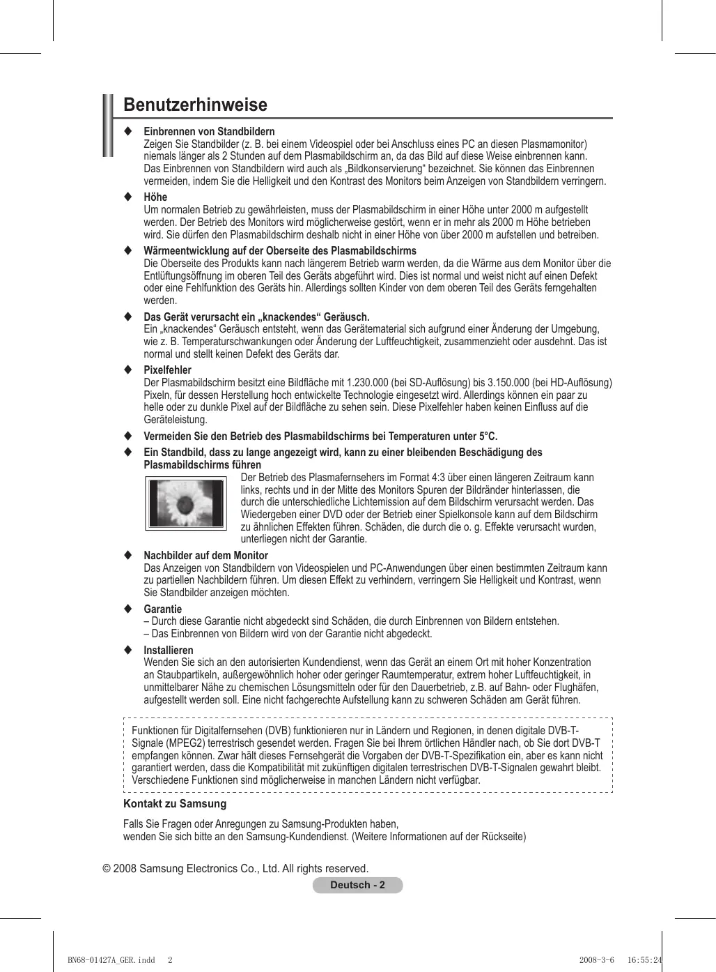 2008-3-6 16:54:16 Benutzerhinweise Einbrennen von Standbildern Zeigen Sie Standbilder (z. B. bei einem Videospiel oder bei Anschluss eines PC an diesen Plasmamonitor) niemals länger als 2 Stunden auf dem Plasmabildschirm an, da das Bild auf diese Weise einbrennen kann. Das Einbrennen von Standbildern wird auch als „Bildkonservierung“ bezeichnet. Sie können das Einbrennen vermeiden, indem Sie die Helligkeit und den Kontrast des Monitors beim Anzeigen von Standbildern verringern. Höhe Um normalen Betrieb zu gewährleisten, muss der Plasmabildschirm in einer Höhe unter 2000 m aufgestellt werden. Der Betrieb des Monitors wird möglicherweise gestört, wenn er in mehr als 2000 m Höhe betrieben wird. Sie dürfen den Plasmabildschirm deshalb nicht in einer Höhe von über 2000 m aufstellen und betreiben. Wärmeentwicklung auf der Oberseite des Plasmabildschirms Die Oberseite des Produkts kann nach längerem Betrieb warm werden, da die Wärme aus dem Monitor über die Entlüftungsöffnung im oberen Teil des Geräts abgeführt wird. Dies ist normal und weist nicht auf einen Defekt oder eine Fehlfunktion des Geräts hin. Allerdings sollten Kinder von dem oberen Teil des Geräts ferngehalten werden. Das Gerät verursacht ein „knackendes“ Geräusch. Ein „knackendes“ Geräusch entsteht, wenn das Gerätematerial sich aufgrund einer Änderung der Umgebung, wie z. B. Temperaturschwankungen oder Änderung der Luftfeuchtigkeit, zusammenzieht oder ausdehnt. Das ist normal und stellt keinen Defekt des Geräts dar. Pixelfehler Der Plasmabildschirm besitzt eine Bildfläche mit 1.230.000 (bei SD-Auflösung) bis 3.150.000 (bei HD-Auflösung) Pixeln, für dessen Herstellung hoch entwickelte Technologie eingesetzt wird. Allerdings können ein paar zu helle oder zu dunkle Pixel auf der Bildfläche zu sehen sein. Diese Pixelfehler haben keinen Einfluss auf die Geräteleistung. Vermeiden Sie den Betrieb des Plasmabildschirms bei Temperaturen unter 5°C. Ein Standbild, dass zu lange angezeigt wird, kann zu einer bleibenden Beschädigung des Plasmabildschirms führen Der Betrieb des Plasmafernsehers im Format 4:3 über einen längeren Zeitraum kann links, rechts und in der Mitte des Monitors Spuren der Bildränder hinterlassen, die durch die unterschiedliche Lichtemission auf dem Bildschirm verursacht werden. Das Wiedergeben einer DVD oder der Betrieb einer Spielkonsole kann auf dem Bildschirm zu ähnlichen Effekten führen. Schäden, die durch die o. g. Effekte verursacht wurden, unterliegen nicht der Garantie. Nachbilder auf dem Monitor Das Anzeigen von Standbildern von Videospielen und PC-Anwendungen über einen bestimmten Zeitraum kann zu partiellen Nachbildern führen. Um diesen Effekt zu verhindern, verringern Sie Helligkeit und Kontrast, wenn Sie Standbilder anzeigen möchten. Garantie – Durch diese Garantie nicht abgedeckt sind Schäden, die durch Einbrennen von Bildern entstehen. – Das Einbrennen von Bildern wird von der Garantie nicht abgedeckt. Installieren Wenden Sie sich an den autorisierten Kundendienst, wenn das Gerät an einem Ort mit hoher Konzentration an Staubpartikeln, außergewöhnlich hoher oder geringer Raumtemperatur, extrem hoher Luftfeuchtigkeit, in unmittelbarer Nähe zu chemischen Lösungsmitteln oder für den Dauerbetrieb, z.B. auf Bahn- oder Flughäfen, aufgestellt werden soll. Eine nicht fachgerechte Aufstellung kann zu schweren Schäden am Gerät führen. Funktionen für Digitalfernsehen (DVB) funktionieren nur in Ländern und Regionen, in denen digitale DVB-TSignale (MPEG2) terrestrisch gesendet werden. Fragen Sie bei Ihrem örtlichen Händler nach, ob Sie dort DVB-T empfangen können. Zwar hält dieses Fernsehgerät die Vorgaben der DVB-T-Spezifikation ein, aber es kann nicht garantiert werden, dass die Kompatibilität mit zukünftigen digitalen terrestrischen DVB-T-Signalen gewahrt bleibt. Verschiedene Funktionen sind möglicherweise in manchen Ländern nicht verfügbar. Kontakt zu Samsung Falls Sie Fragen oder Anregungen zu Samsung-Produkten haben, wenden Sie sich bitte an den Samsung-Kundendienst. (Weitere Informationen auf der Rückseite) © 2008 Samsung Electronics Co., Ltd. All rights reserved. Deutsch - BN68-01427A_GER.indd