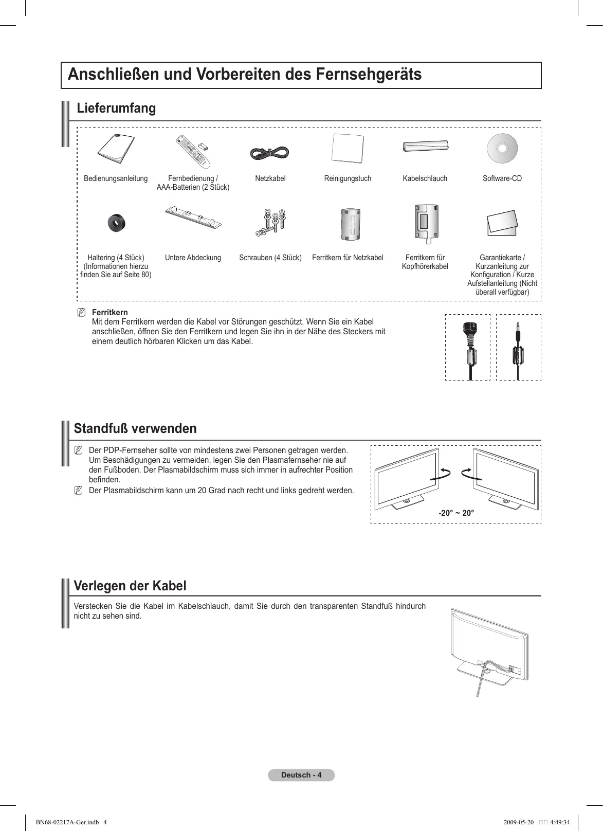 Hinweis Zielwahltaste TOOLS Deutsch - 3 BN68-02217A-Ger.indb 3 2009-05-20 4:49:31 Anschließen und Vorbereiten des Fernsehgeräts Lieferumfang Bedienungsanleitung Fernbedienung / AAA-Batterien (2 Stück) Netzkabel Reinigungstuch Kabelschlauch Software-CD Haltering (4 Stück) (Informationen hierzu finden Sie auf Seite 80) Untere Abdeckung Schrauben (4 Stück) Ferritkern für Netzkabel Ferritkern für Kopfhörerkabel Garantiekarte / Kurzanleitung zur Konfiguration / Kurze Aufstellanleitung (Nicht überall verfügbar) NN Ferritkern Mit dem Ferritkern werden die Kabel vor Störungen geschützt. Wenn Sie ein Kabel anschließen, öffnen Sie den Ferritkern und legen Sie ihn in der Nähe des Steckers mit einem deutlich hörbaren Klicken um das Kabel. Standfuß verwenden NN Der PDP-Fernseher sollte von mindestens zwei Personen getragen werden. Um Beschädigungen zu vermeiden, legen Sie den Plasmafernseher nie auf den Fußboden. Der Plasmabildschirm muss sich immer in aufrechter Position befinden. NN Der Plasmabildschirm kann um 20 Grad nach recht und links gedreht werden. -20° ~ 20° Verlegen der Kabel Verstecken Sie die Kabel im Kabelschlauch, damit Sie durch den transparenten Standfuß hindurch nicht zu sehen sind. Deutsch - 4 BN68-02217A-Ger.indb 4 2009-05-20 4:49:34 Bedienfeld Form und Farbe des Geräts können sich je nach Modell unterscheiden. 1 SOURCE Schaltet zwischen den verfügbaren Signalquellen um (TV, Ext1, Ext2, AV, Component, PC, HDMI1, HDMI2/DVI, HDMI3, HDMI4, USB). NN Im Bildschirmmenü können Sie diese Schaltfläche genauso wie die ENTERE-Taste auf der Fernbedienung verwenden. 2 MENU Drücken Sie diese Taste, um ein Bildschirmmenü zu den Funktionen des Fernsehgeräts einzublenden. 3 + Hiermit erhöhen oder verringern Sie die Lautstärke. Im Bildschirmmenü können Sie die Schaltflächen + – wie die Tasten ◄ und ► auf der Fernbedienung verwenden.