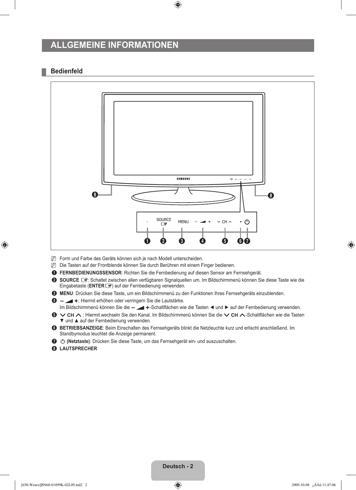 - ❑ Vorsichtsmaßnahmen beim Anzeigen von Standbildern Ein Standbild kann zu einer dauerhaften Beschädigung des Bildschirms führen. ● Zeigen Sie Standbilder und teilweise unbewegte Bilder nicht länger als 2 Stunden auf dem LCD-Bildschirm an, da das Bild auf diese Weise einbrennen kann. Das Einbrennen von Standbildern wird auch als ‘Bildkonservierung’ bezeichnet. Sie können das Einbrennen vermeiden, indem Sie die Helligkeit und den Kontrast des Bildschirms beim Anzeigen von Standbildern verringern. Der Betrieb des LCD-Monitors im Format 4:3 für einen längeren Zeitraum kann links, rechts und in der Mitte des Monitors Spuren der Bildränder hinterlassen, die durch die unterschiedliche Lichtemission auf dem Monitor verursacht werden. DVD- oder Spielekonsole-Wiedergabe können einen ähnlichen Effekt verursachen. Schäden, die durch die o. g. Effekte verursacht wurden, fallen nicht unter die Garantie. ● Durch das Anzeigen der Standbilder von Videospielen oder vom PC über einen gewissen Zeitraum hinaus können partielle Nachbilder entstehen. Um diesen Effekt zu verhindern, verringern Sie Helligkeit und Kontrast, wenn Sie Standbilder anzeigen möchten. © 2009 Samsung Electronics Co., Ltd. Alle Rechte vorbehalten. [650-Weuro]BN68-01899K-02L09.ind1 1 2009-10-08 ¿ÀÀü 11:47:05 Inhalt ALLGEMEINE INFORMATIONEN ■ Bedienfeld p. 2