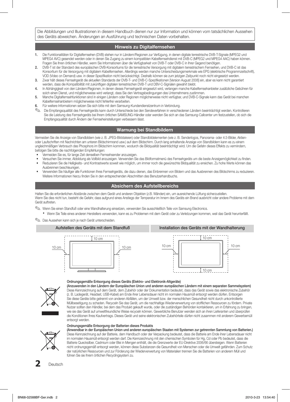 2010-3-23 15:16:56 Cette page est laissée intentionnellement vierge. BN68-02588ABF-Fre.indb 34 2010-3-23 15:16:56 Die Abbildungen und Illustrationen in diesem Handbuch dienen nur zur Information und können vom tatsächlichen Aussehen des Geräts abweichen. Änderungen an Ausführung und technischen Daten vorbehalten. Hinweis zu Digitalfernsehen Die Funktionalitäten für Digitalfernsehen (DVB) stehen nur in Ländern/Regionen zur Verfügung, in denen digitale terrestrische DVB-T-Signale (MPEG2 und MPEG4 AVC) gesendet werden oder in denen Sie Zugang zu einem kompatiblen Kabelfernsehdienst mit DVB-C (MPEG2 und MPEG4 AAC) haben können. Fragen Sie Ihren örtlichen Händler, wenn Sie Informationen über die Verfügbarkeit von DVB-T oder DVB-C in Ihrer Gegend benötigen. 2. DVB-T ist der Standard des europäischen DVB-Konsortiums für die terrestrische Versorgung mit digitalem terrestrischem Fernsehen, und DVB-C ist das Konsortium für die Versorgung mit digitalem Kabelfernsehen. Allerdings werden manche Unterscheidungsmerkmale wie EPG (elektrische Programmzeitschrift), VOD (Video on Demand) usw. in dieser Spezifikation nicht berücksichtigt. Deshalb können sie zum jetzigen Zeitpunkt noch nicht eingesetzt werden. 3. Zwar hält dieses Fernsehgerät die aktuellen Standards der DVB-T- und DVB-C-Spezifikationen [Version August 2008] ein, aber es kann nicht garantiert werden, dass die Kompatibilität mit zukünftigen digitalen terrestrischen DVB-T und DBV-C-Signalen gewahrt bleibt. 4. In Abhängigkeit von den Ländern/Regionen, in denen dieses Fernsehgerät eingesetzt wird, verlangen manche Kabelfernsehanbieter zusätzliche Gebühren für solch einen Dienst, und möglicherweise wird verlangt, dass Sie den Vertragsbedingungen des Unternehmens zustimmen. 5. Manche Digitalfernsehfunktionen sind in einigen Ländern oder Regionen möglicherweise nicht verfügbar, und DVB-C-Signale kann das Gerät bei manchen Kabelfernsehanbietern möglicherweise nicht fehlerfrei verarbeiten.