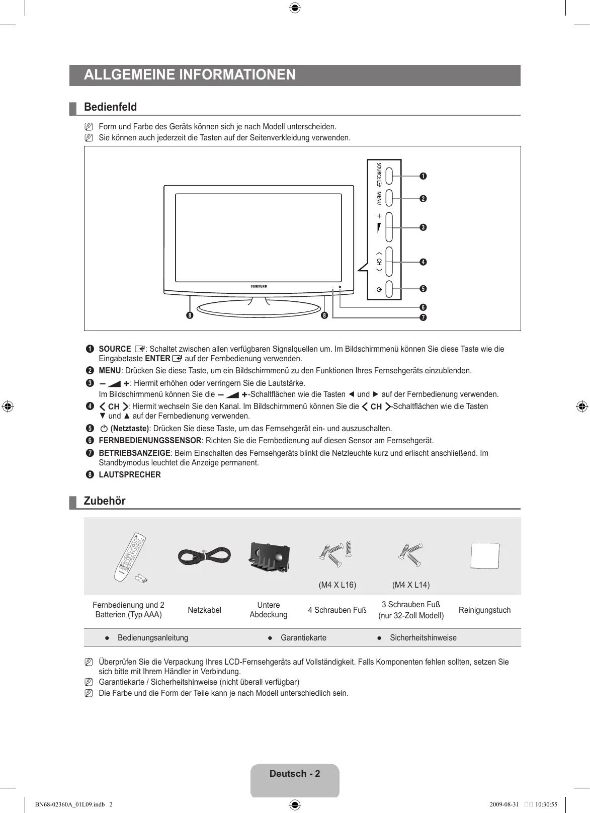 1 SOURCE E: Schaltet zwischen allen verfügbaren Signalquellen um. Im Bildschirmmenü können Sie diese Taste wie die Eingabetaste ENTERE auf der Fernbedienung verwenden. 2 MENU: Drücken Sie diese Taste, um ein Bildschirmmenü zu den Funktionen Ihres Fernsehgeräts einzublenden. 3 Y: Hiermit erhöhen oder verringern Sie die Lautstärke. Im Bildschirmmenü können Sie die Y-Schaltflächen wie die Tasten ◄ und ► auf der Fernbedienung verwenden. 4 Z: Hiermit wechseln Sie den Kanal. Im Bildschirmmenü können Sie die Z-Schaltflächen wie die Tasten ▼ und ▲ auf der Fernbedienung verwenden. 5 P (Netztaste): Drücken Sie diese Taste, um das Fernsehgerät ein- und auszuschalten. 6 FERNBEDIENUNGSSENSOR: Richten Sie die Fernbedienung auf diesen Sensor am Fernsehgerät. 7 BETRIEBSANZEIGE: Beim Einschalten des Fernsehgeräts blinkt die Netzleuchte kurz und erlischt anschließend. Im Standbymodus leuchtet die Anzeige permanent. 8 LAUTSPRECHER ¦ Zubehör Fernbedienung und 2 Batterien (Typ AAA) Netzkabel ● Bedienungsanleitung Untere Abdeckung (M4 X L16) (M4 X L14) 4 Schrauben Fuß 3 Schrauben Fuß (nur 32-Zoll Modell) ● Garantiekarte Reinigungstuch ● Sicherheitshinweise N Überprüfen Sie die Verpackung Ihres LCD-Fernsehgeräts auf Vollständigkeit. Falls Komponenten fehlen sollten, setzen Sie sich bitte mit Ihrem Händler in Verbindung. N Garantiekarte / Sicherheitshinweise (nicht überall verfügbar) N Die Farbe und die Form der Teile kann je nach Modell unterschiedlich sein. Deutsch - BN68-02360A_01L09.indb 2 2009-08-31 10:30:55 ¦ Anschlussfeld [Rückseite des Fernsehgeräts]