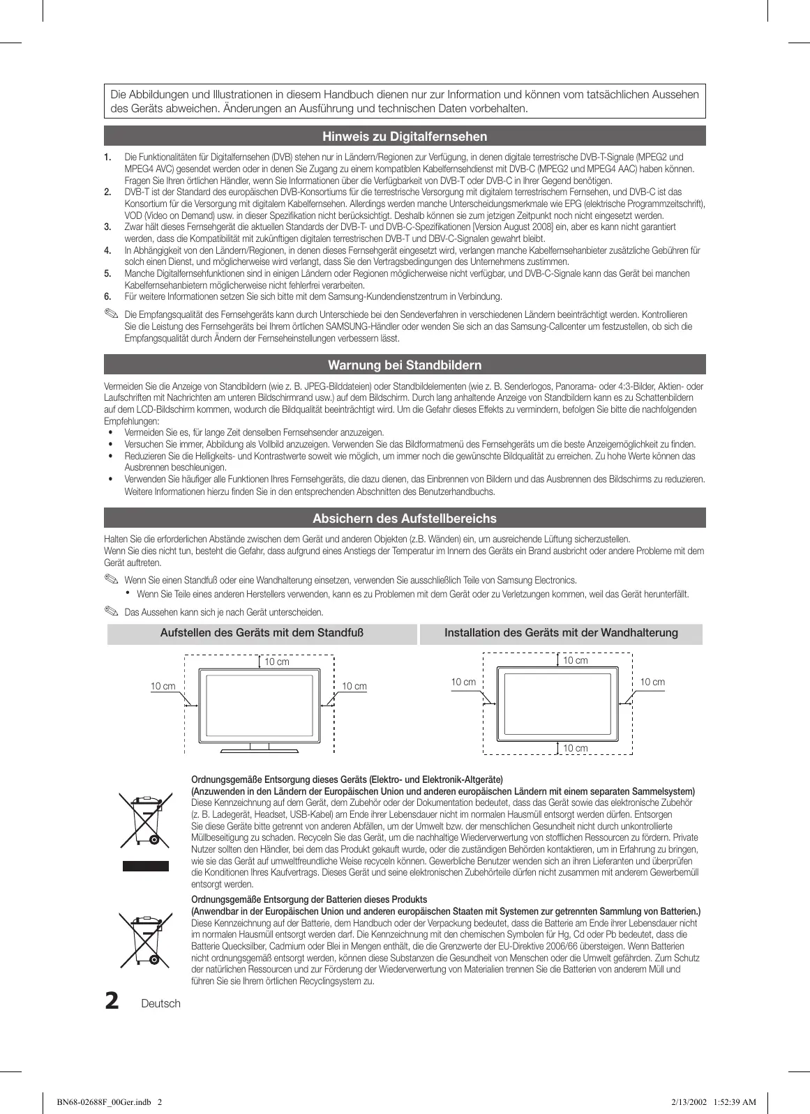 Ordnungsgemäße Entsorgung der Batterien dieses Produkts (Anwendbar in der Europäischen Union und anderen europäischen Staaten mit Systemen zur getrennten Sammlung von Batterien.) Diese Kennzeichnung auf der Batterie, dem Handbuch oder der Verpackung bedeutet, dass die Batterie am Ende ihrer Lebensdauer nicht im normalen Hausmüll entsorgt werden darf. Die Kennzeichnung mit den chemischen Symbolen für Hg, Cd oder Pb bedeutet, dass die Batterie Quecksilber, Cadmium oder Blei in Mengen enthält, die die Grenzwerte der EU-Direktive 2006/66 übersteigen. Wenn Batterien nicht ordnungsgemäß entsorgt werden, können diese Substanzen die Gesundheit von Menschen oder die Umwelt gefährden. Zum Schutz der natürlichen Ressourcen und zur Förderung der Wiederverwertung von Materialien trennen Sie die Batterien von anderem Müll und führen Sie sie Ihrem örtlichen Recyclingsystem zu. Deutsch BN68-02688F_00Ger.indb 2 2/13/2002 1:52:39 AM Inhalt Erste Schritte