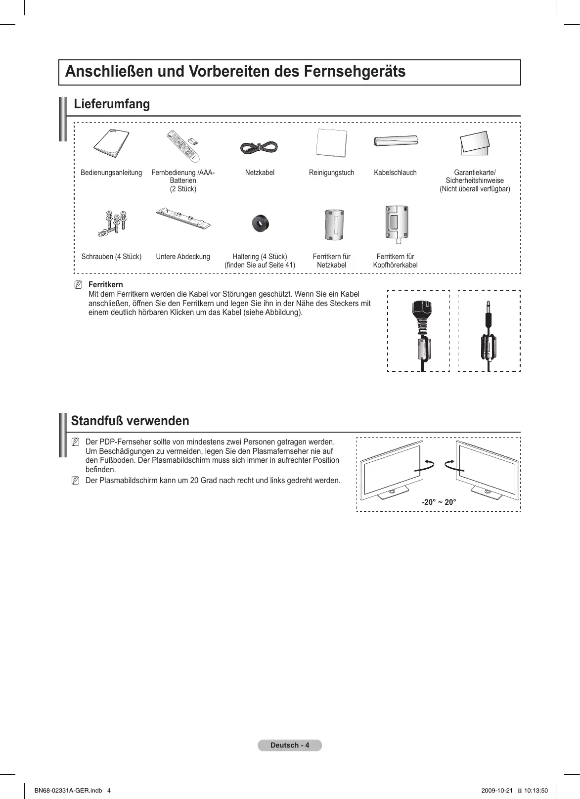 Hinweis Zielwahltaste TOOLS Deutsch - 3 BN68-02331A-GER.indb 3 2009-10-21 10:13:46 Anschließen und Vorbereiten des Fernsehgeräts Lieferumfang Bedienungsanleitung Fernbedienung /AAABatterien (2 Stück) Netzkabel Reinigungstuch Kabelschlauch Schrauben (4 Stück) Untere Abdeckung Haltering (4 Stück) (finden Sie auf Seite 41) Ferritkern für Netzkabel Ferritkern für Kopfhörerkabel Garantiekarte/ Sicherheitshinweise (Nicht überall verfügbar) NN Ferritkern Mit dem Ferritkern werden die Kabel vor Störungen geschützt. Wenn Sie ein Kabel anschließen, öffnen Sie den Ferritkern und legen Sie ihn in der Nähe des Steckers mit einem deutlich hörbaren Klicken um das Kabel (siehe Abbildung). Standfuß verwenden NN Der PDP-Fernseher sollte von mindestens zwei Personen getragen werden. Um Beschädigungen zu vermeiden, legen Sie den Plasmafernseher nie auf den Fußboden. Der Plasmabildschirm muss sich immer in aufrechter Position befinden. NN Der Plasmabildschirm kann um 20 Grad nach recht und links gedreht werden. -20° ~ 20° Deutsch - 4 BN68-02331A-GER.indb 4 2009-10-21 10:13:50 Bedienfeld Tasten auf der Vorderseite NN Form und Farbe des Geräts können sich je nach Modell unterscheiden. 1 SOURCE Schaltet zwischen den verfügbaren Signalquellen um (TV, Ext1, Ext2, AV, Component, PC, HDMI1, HDMI2/DVI, HDMI3, HDMI4, USB). NN Im Bildschirmmenü können Sie diese Schaltfläche genauso wie die ENTER verwenden. -Taste auf der Fernbedienung 2 MENU Drücken Sie diese Taste, um ein Bildschirmmenü zu den Funktionen des Fernsehgeräts einzublenden 3 + Hiermit erhöhen oder verringern Sie die Lautstärke. Im Bildschirmmenü können Sie die Schaltflächen + – wie die Tasten ◄ und ► auf der Fernbedienung verwenden.