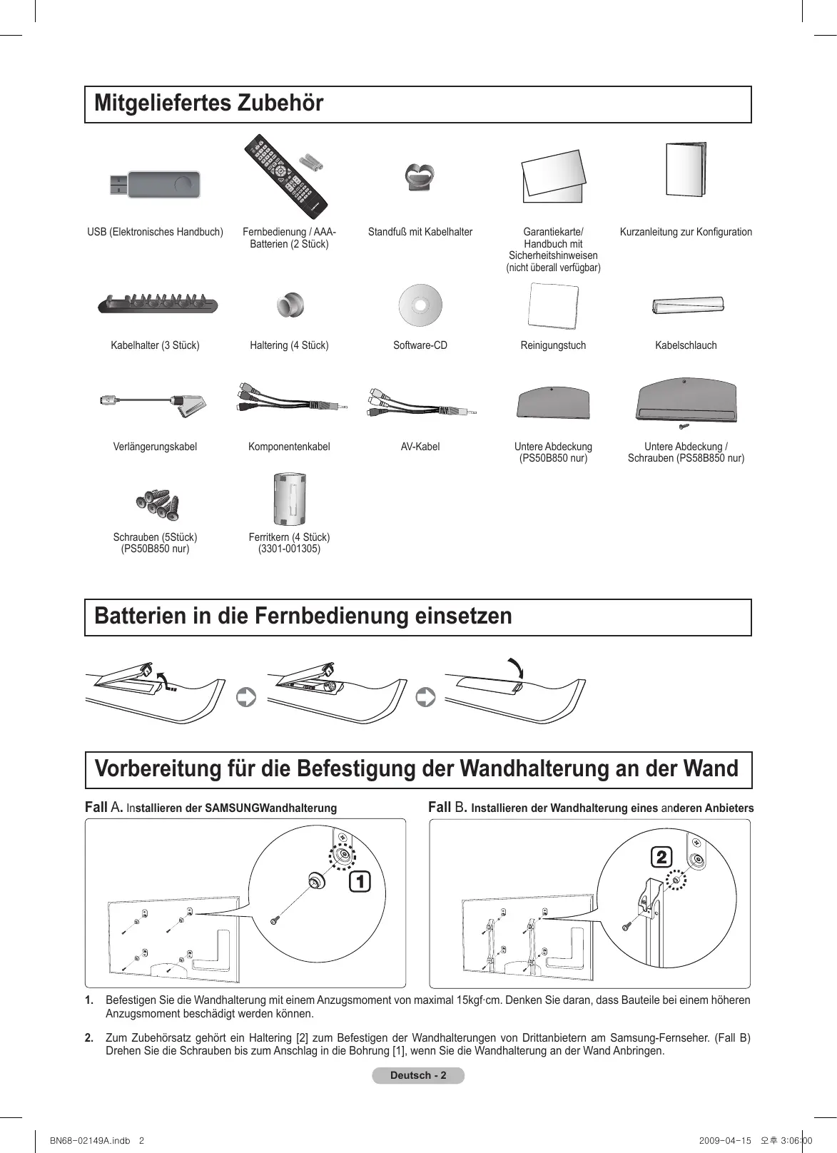 Batterien in die Fernbedienung einsetzen Vorbereitung für die Befestigung der Wandhalterung an der Wand Fall A. Installieren der SAMSUNGWandhalterung Fall B. Installieren der Wandhalterung eines anderen Anbieters