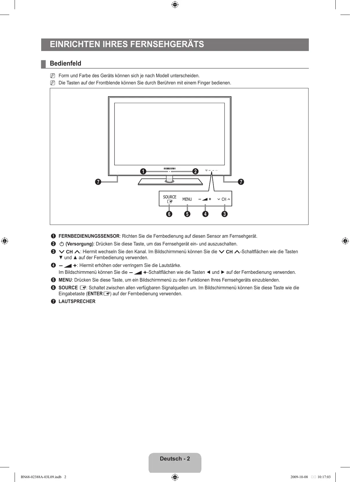 Hinweis Zielwahltaste TOOLS-Taste Drücken Deutsch - BN68-02388A-03L09.indb 1 2009-10-08 10:17:03 Einrichten Ihres Fernsehgeräts ¦ Bedienfeld N Form und Farbe des Geräts können sich je nach Modell unterscheiden. N Die Tasten auf der Frontblende können Sie durch Berühren mit einem Finger bedienen.