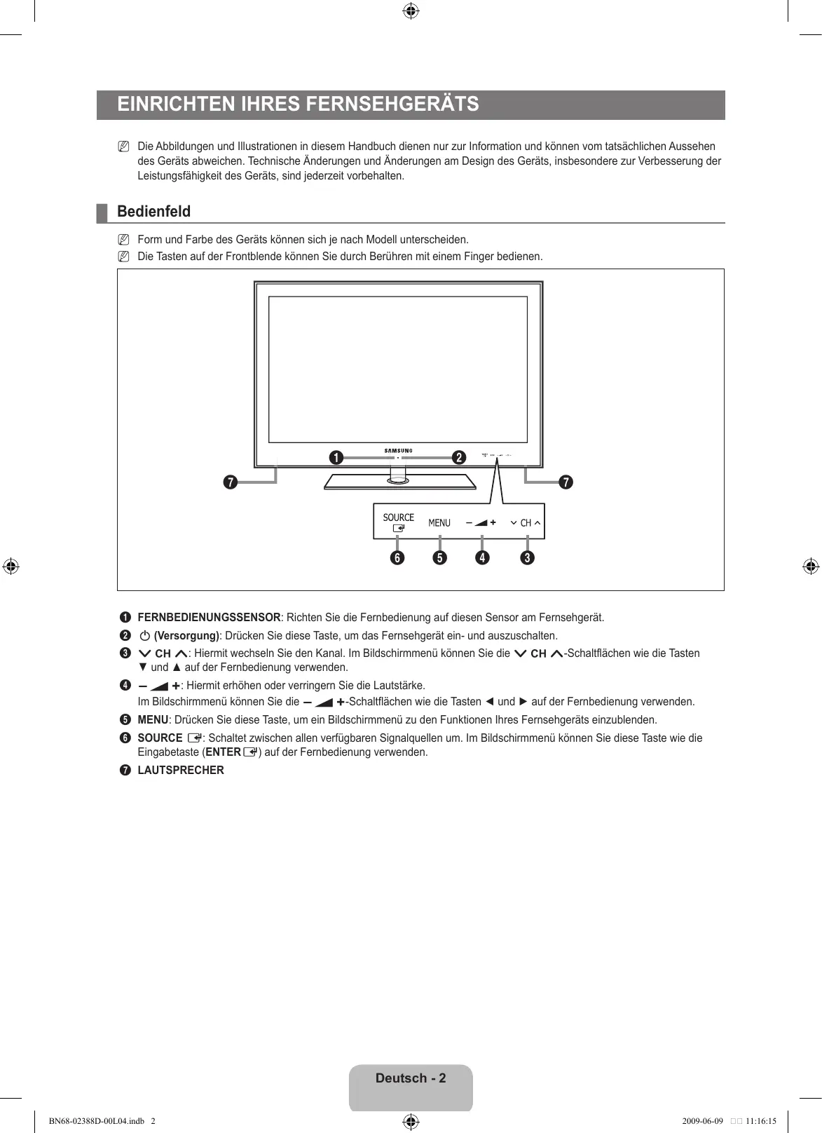 Hinweis Zielwahltaste TOOLS-Taste Drücken Deutsch - BN68-02388D-00L04.indb 1 2009-06-09 11:16:15 Einrichten Ihres Fernsehgeräts N Die Abbildungen und Illustrationen in diesem Handbuch dienen nur zur Information und können vom tatsächlichen Aussehen des Geräts abweichen. Technische Änderungen und Änderungen am Design des Geräts, insbesondere zur Verbesserung der Leistungsfähigkeit des Geräts, sind jederzeit vorbehalten. ¦ Bedienfeld N Form und Farbe des Geräts können sich je nach Modell unterscheiden. N Die Tasten auf der Frontblende können Sie durch Berühren mit einem Finger bedienen.