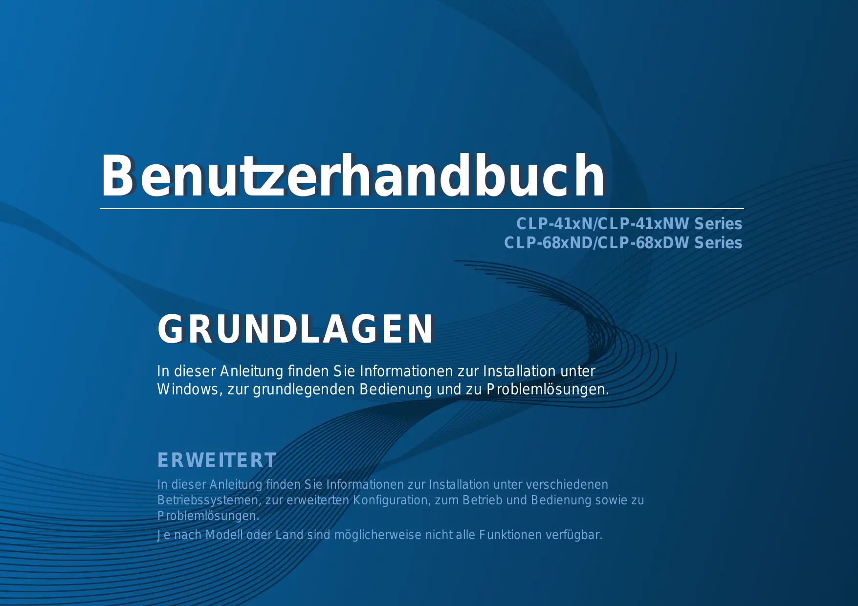 Benutzerhandbuch CLP-41xN/CLP-41xNW Series CLP-68xND/CLP-68xDW Series GRUNDLAGEN GRUNDLAGEN In dieser Anleitung finden Sie Informationen zur Installation unter Windows, zur grundlegenden Bedienung und zu Problemlösungen. ERWEITERT In dieser Anleitung finden Sie Informationen zur Installation unter verschiedenen Betriebssystemen, zur erweiterten Konfiguration, zum Betrieb und Bedienung sowie zu Problemlösungen. Je nach Modell oder Land sind möglicherweise nicht alle Funktionen verfügbar. GRUNDLAGEN