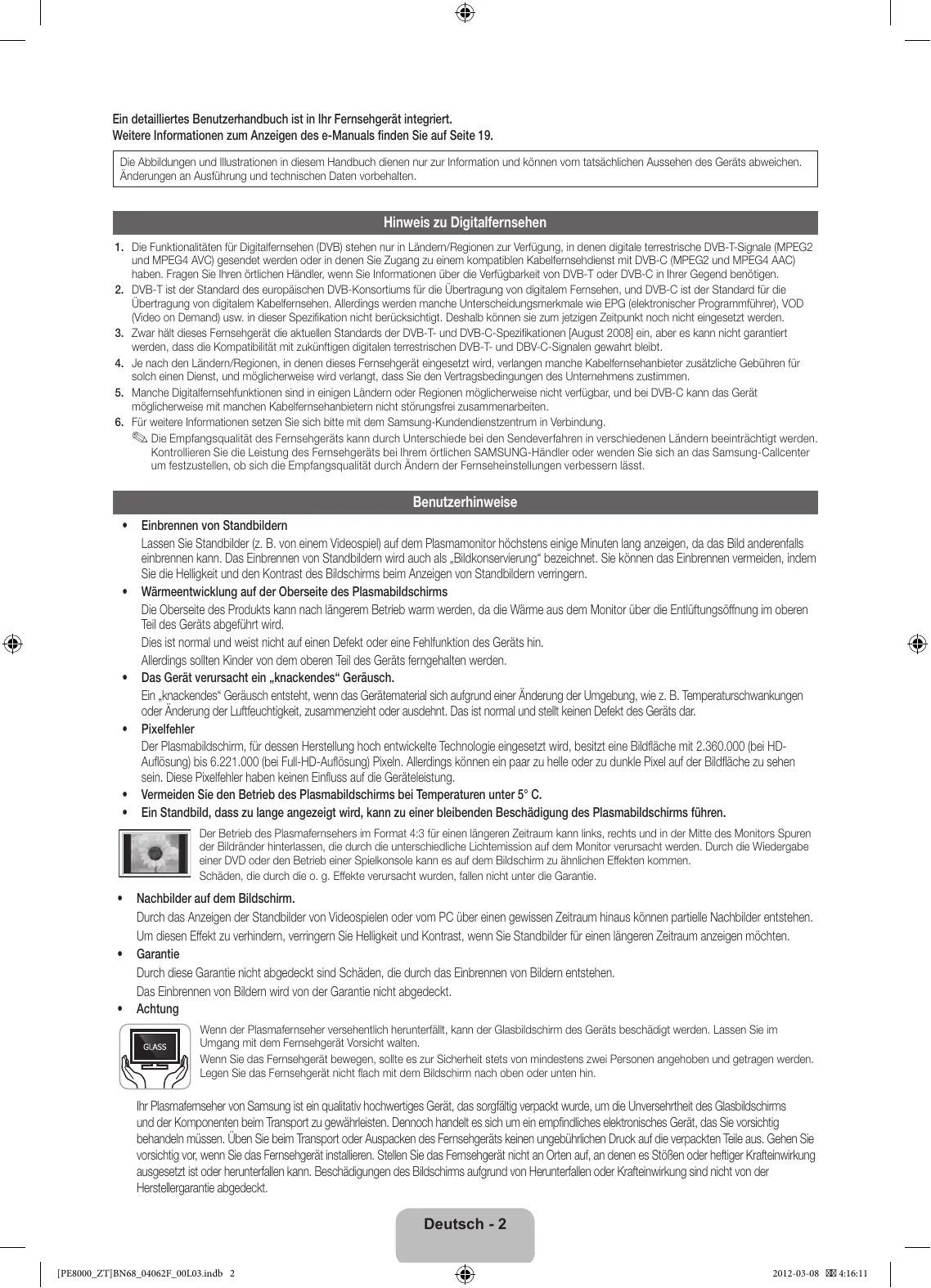 - • L'uso di questa apparecchiatura è consentito in tutti i paesi europei. Licenza Italiano - 24 [PE8000_ZT]BN68_04062F_00L03.indb 24 2012-03-08 4:16:11 Diagrammi a blocchi Italiano - 25 [PE8000_ZT]BN68_04062F_00L03.indb 25 2012-03-08 4:16:11 Ein detailliertes Benutzerhandbuch ist in Ihr Fernsehgerät integriert. Weitere Informationen zum Anzeigen des e-Manuals finden Sie auf Seite 19. Die Abbildungen und Illustrationen in diesem Handbuch dienen nur zur Information und können vom tatsächlichen Aussehen des Geräts abweichen. Änderungen an Ausführung und technischen Daten vorbehalten. Hinweis zu Digitalfernsehen 1. Die Funktionalitäten für Digitalfernsehen (DVB) stehen nur in Ländern/Regionen zur Verfügung, in denen digitale terrestrische DVB-T-Signale (MPEG2 und MPEG4 AVC) gesendet werden oder in denen Sie Zugang zu einem kompatiblen Kabelfernsehdienst mit DVB-C (MPEG2 und MPEG4 AAC) haben. Fragen Sie Ihren örtlichen Händler, wenn Sie Informationen über die Verfügbarkeit von DVB-T oder DVB-C in Ihrer Gegend benötigen. 2. DVB-T ist der Standard des europäischen DVB-Konsortiums für die Übertragung von digitalem Fernsehen, und DVB-C ist der Standard für die Übertragung von digitalem Kabelfernsehen. Allerdings werden manche Unterscheidungsmerkmale wie EPG (elektronischer Programmführer), VOD (Video on Demand) usw. in dieser Spezifikation nicht berücksichtigt. Deshalb können sie zum jetzigen Zeitpunkt noch nicht eingesetzt werden. 3. Zwar hält dieses Fernsehgerät die aktuellen Standards der DVB-T- und DVB-C-Spezifikationen [August 2008] ein, aber es kann nicht garantiert werden, dass die Kompatibilität mit zukünftigen digitalen terrestrischen DVB-T- und DBV-C-Signalen gewahrt bleibt. 4. Je nach den Ländern/Regionen, in denen dieses Fernsehgerät eingesetzt wird, verlangen manche Kabelfernsehanbieter zusätzliche Gebühren für solch einen Dienst, und möglicherweise wird verlangt, dass Sie den Vertragsbedingungen des Unternehmens zustimmen. 5. Manche Digitalfernsehfunktionen sind in einigen Ländern oder Regionen möglicherweise nicht verfügbar, und bei DVB-C kann das Gerät möglicherweise mit manchen Kabelfernsehanbietern nicht störungsfrei zusammenarbeiten.
